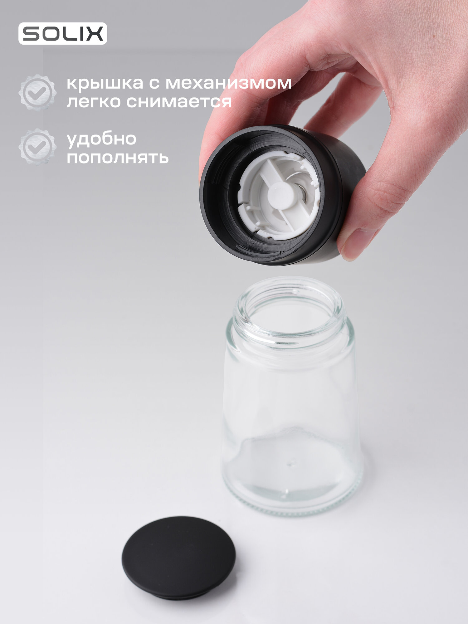Ручная мельница для перца, соли и специй с крышкой SOLIX, 150мл, стекло, керамика, пластик, 2 шт.