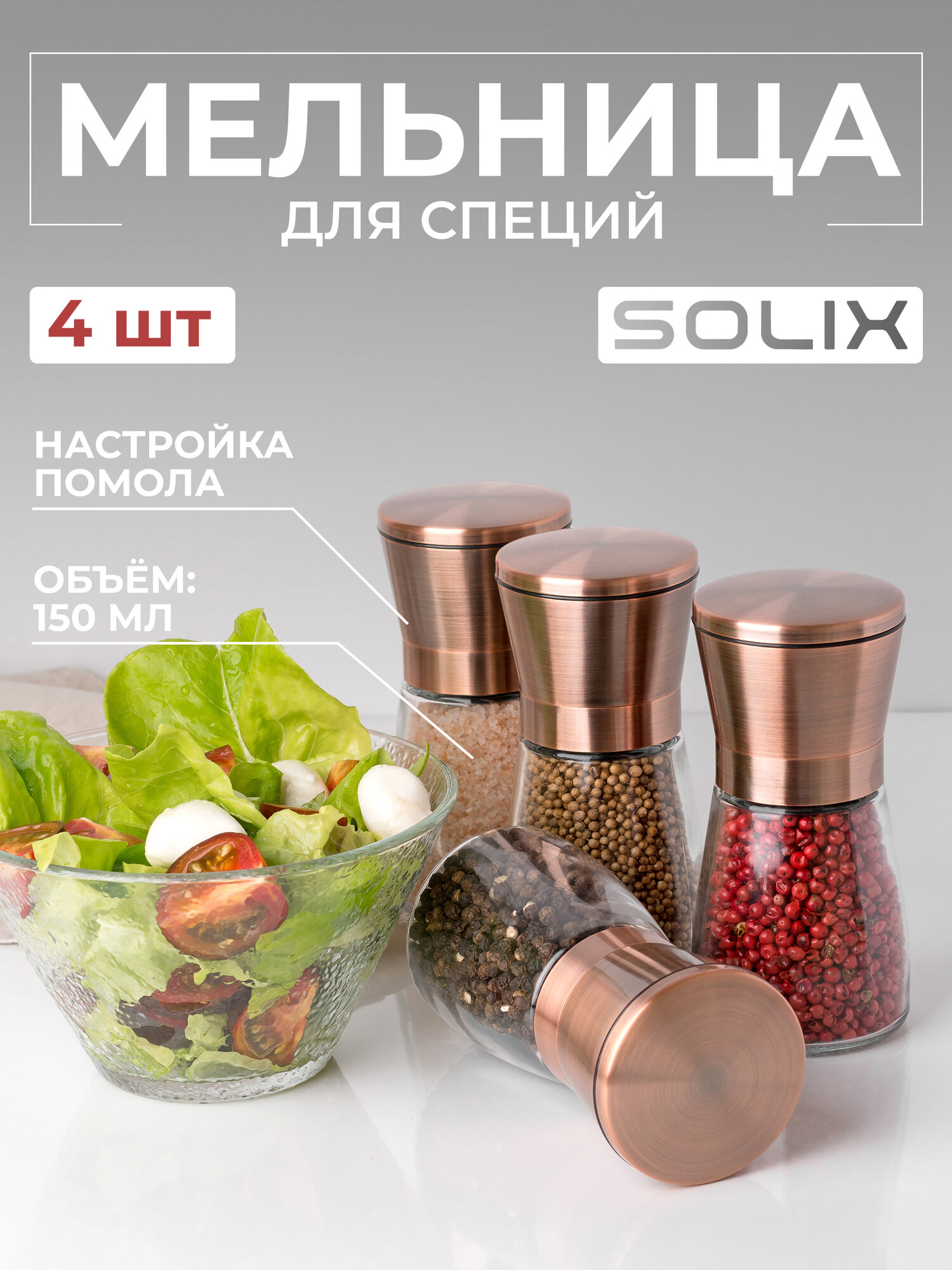Ручная мельница для перца, соли и специй с крышкой SOLIX, 150мл, стекло, керамика, медь, металл, 4 шт. интересное: