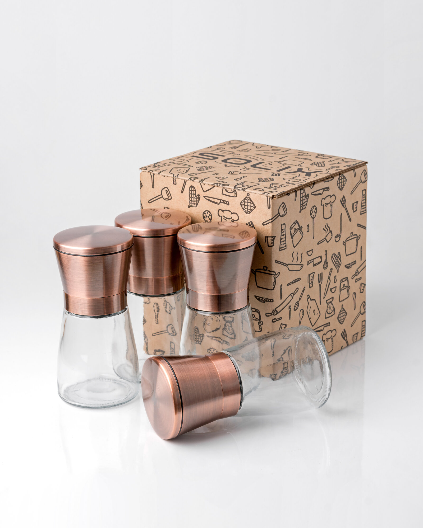 Купить Ручная мельница для перца, соли и специй с крышкой SOLIX, 150мл, стекло, керамика, медь, металл, 4 шт.