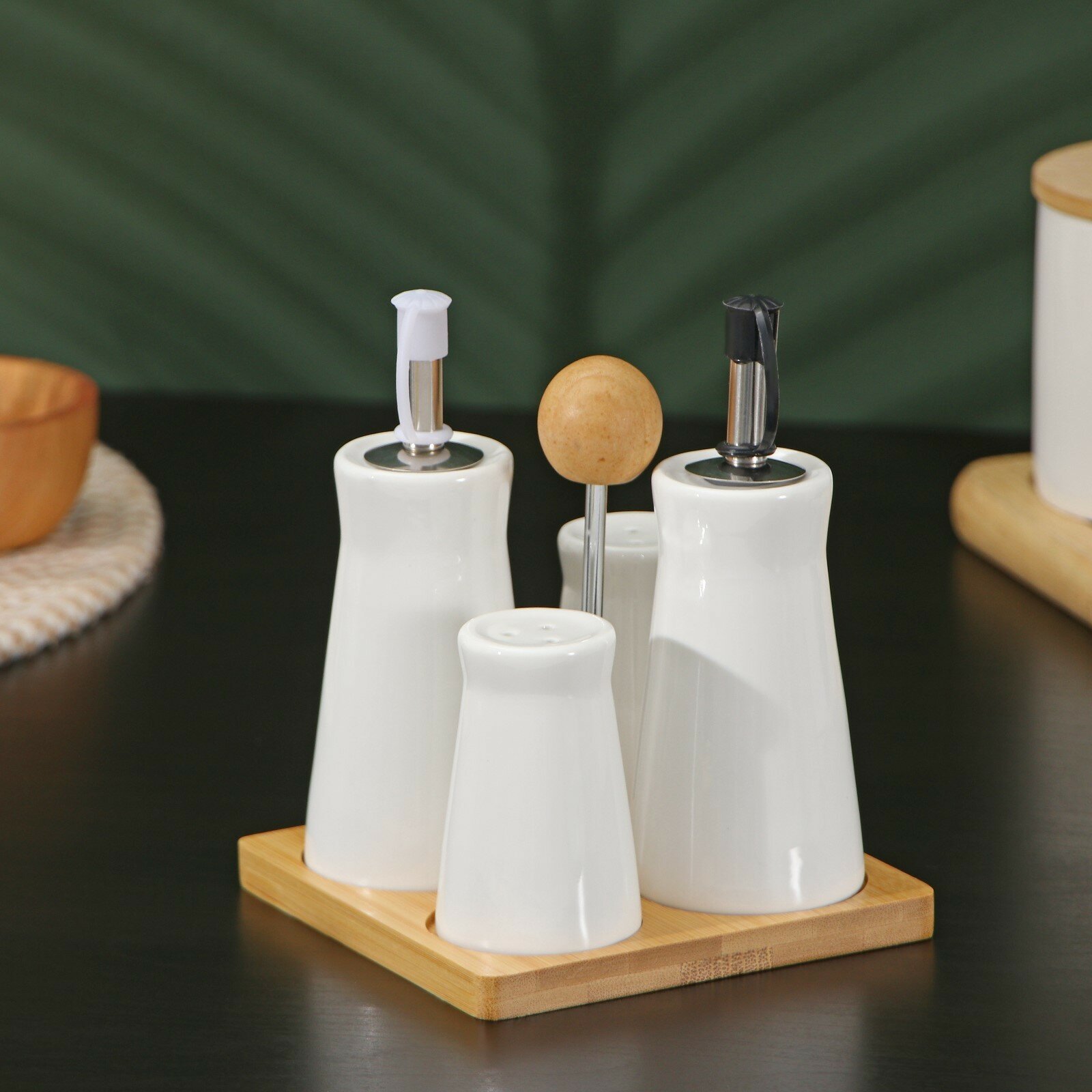 Набор фарфоровый для специй на деревянной подставке, 5 предметов: солонка, перечница, 2 соусника, подставка-держатель, цвет белый интересное: