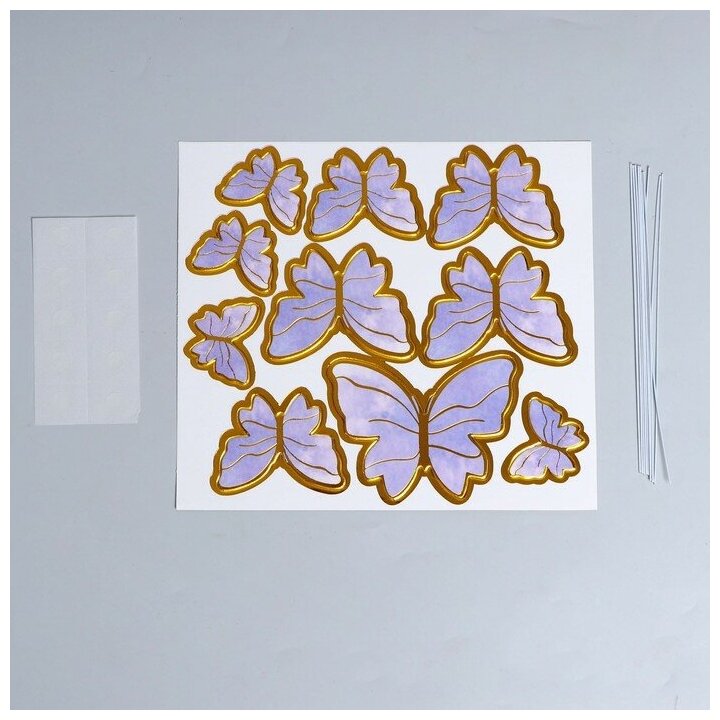 | Комплектация | 10 бумажных бабочек; 10 наклеек двухсторонних; 10 металлических палочек. |