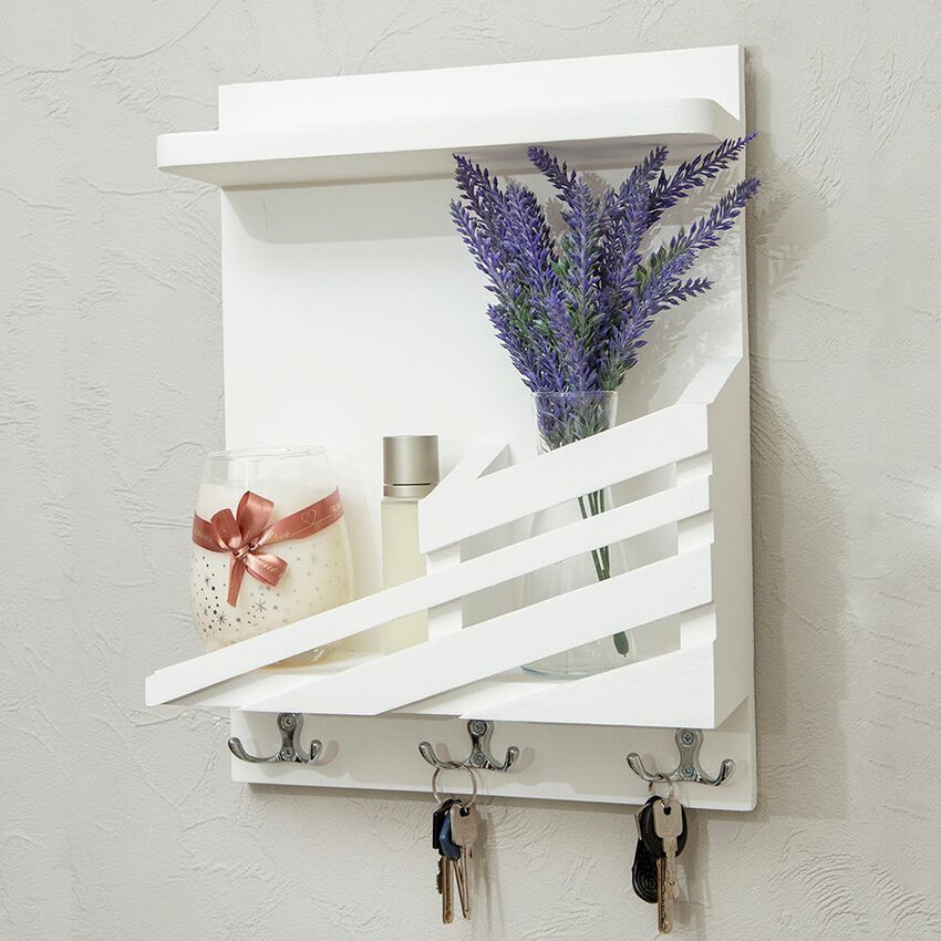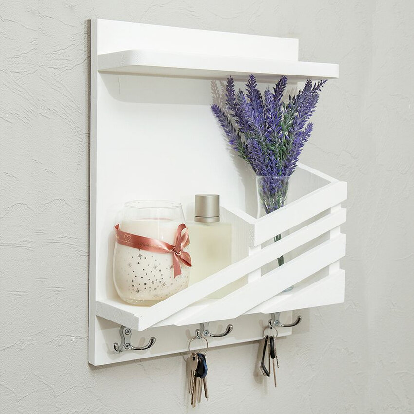 Ключница настенная белая с полкой из дерева в прихожую для ключей
