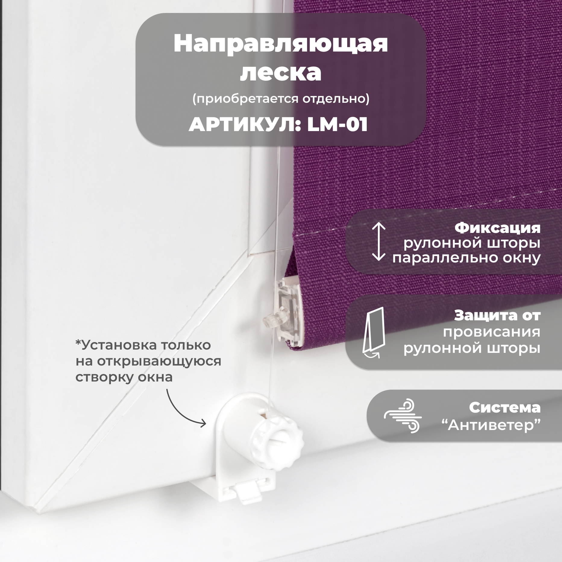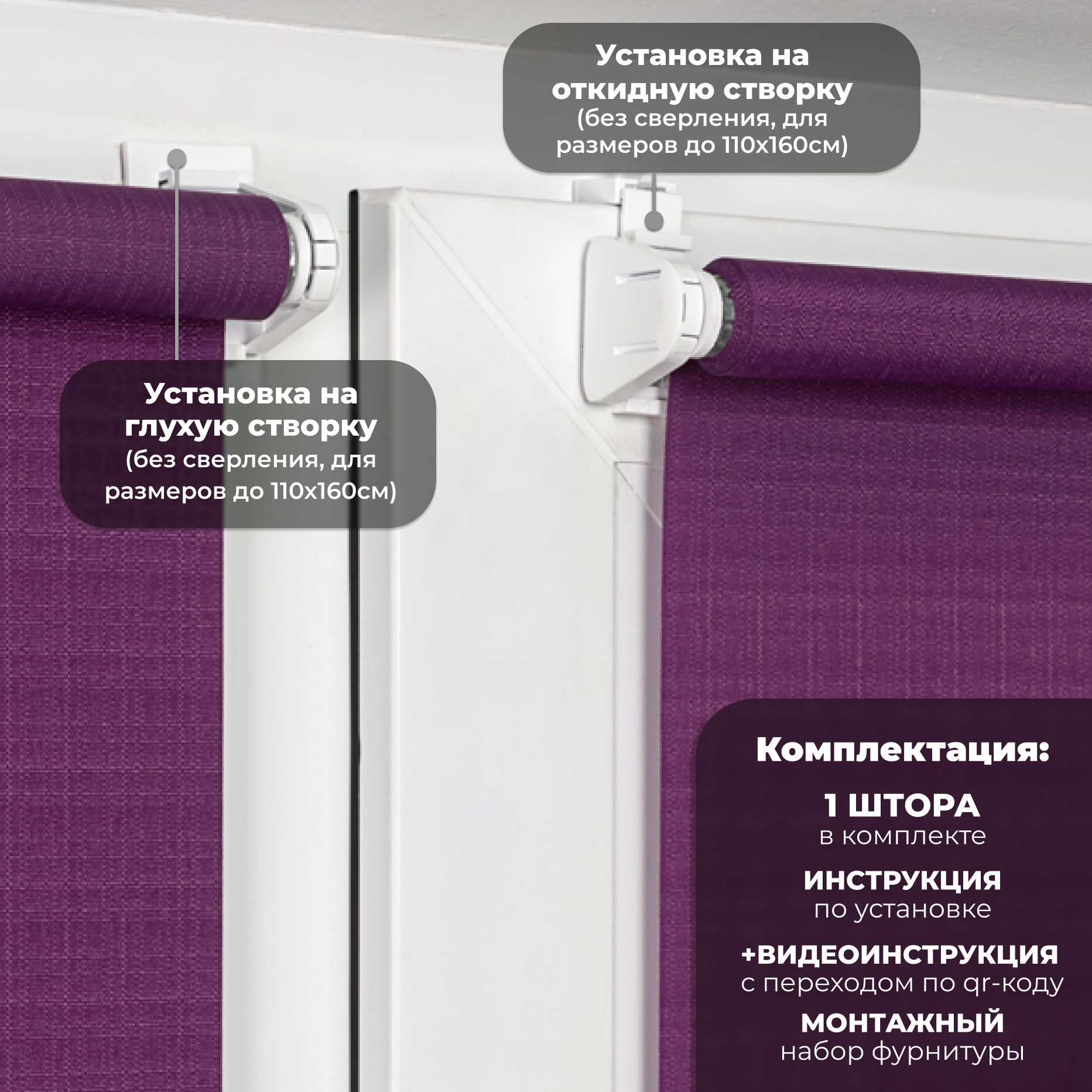 | Дополнительная информация | Несколько вариантов установки: без сверления на пластиковое глухое окно или с поворотно-откидным механизмом; со сверлением - на любое окно, на неподвижную раму, на стену (оконный проем), на раму, к потолку, в проем. |