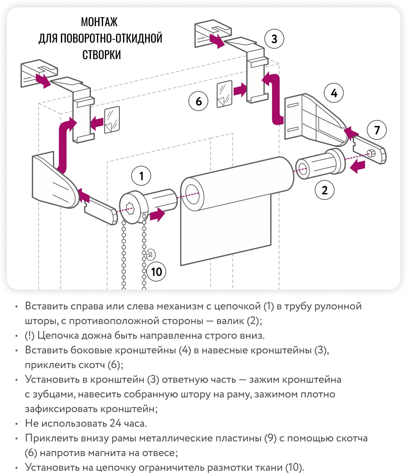 | Комплектация | Механизм с цепочкой-1шт; упорный валик-1шт; боковые кронштейны-2шт; навесные кронштейны с регулировкой под толщину оконного профиля-2шт; монтажные площадки для крепления на глухую створку-2шт; двухсторонний скотч-2шт; крепежный комплект; фиксатор-2шт; ограничитель размотки ткани. |