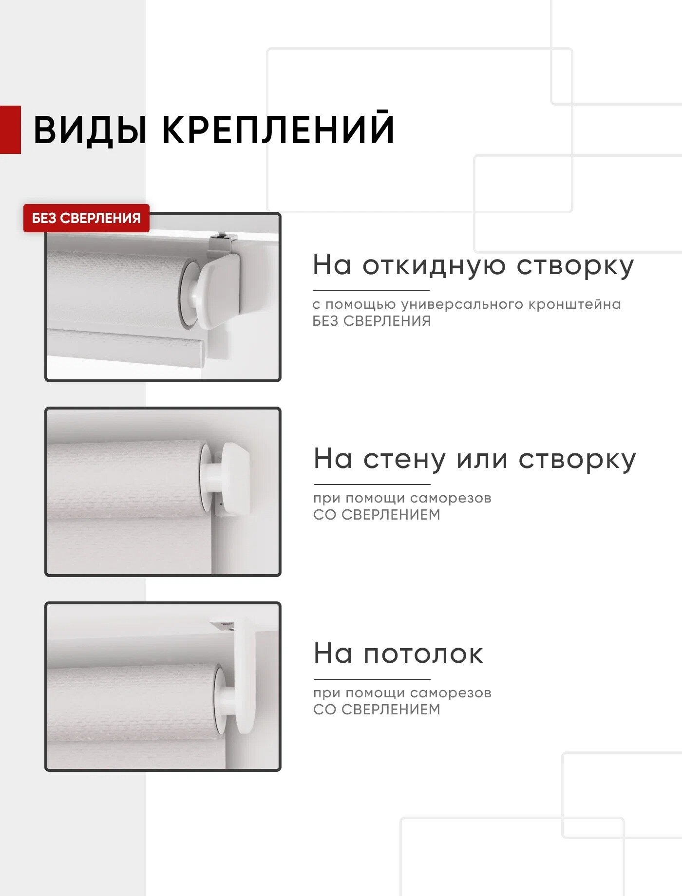 | Дополнительная информация | Рулонную штору нельзя стирать и замывать какими-либо средствами. Размер написан по ширине ткани. Инструкция, как устанавливать входит в комплектацию |