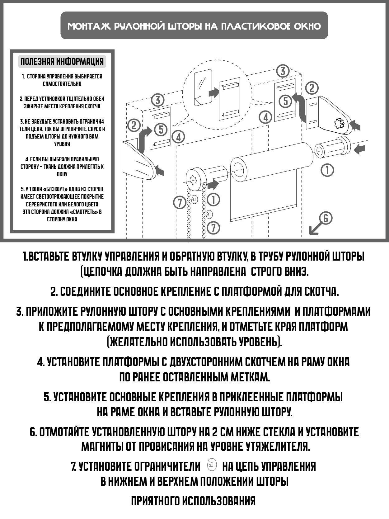 | Комплектация | Труба с тканью - 1шт. Цепь управления - 1 шт. Соеденитель цепи управления - 1шт. Крышка нижняя боковая - 2 шт. Стальной утяжелитель - 1 шт. Ограничитель цепи управления - 1шт. Платформа для скотча - 2 шт. Скотч - 2 шт. Магнит - 2 шт. |