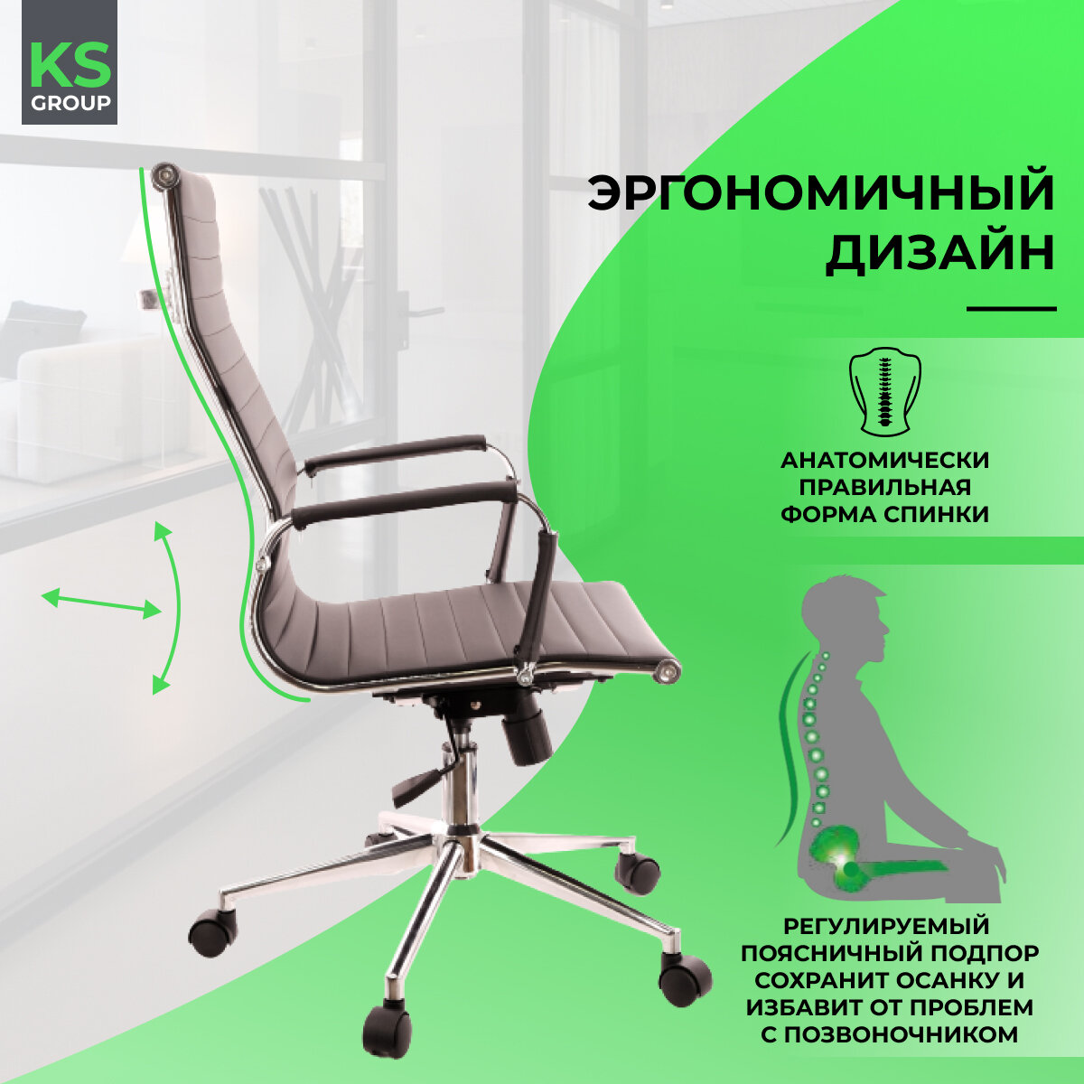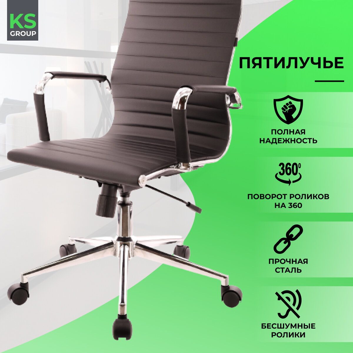 Крепкий металл Качественная экокожа Подлокотники из экокожи сьемные Прорезиненные колеса |