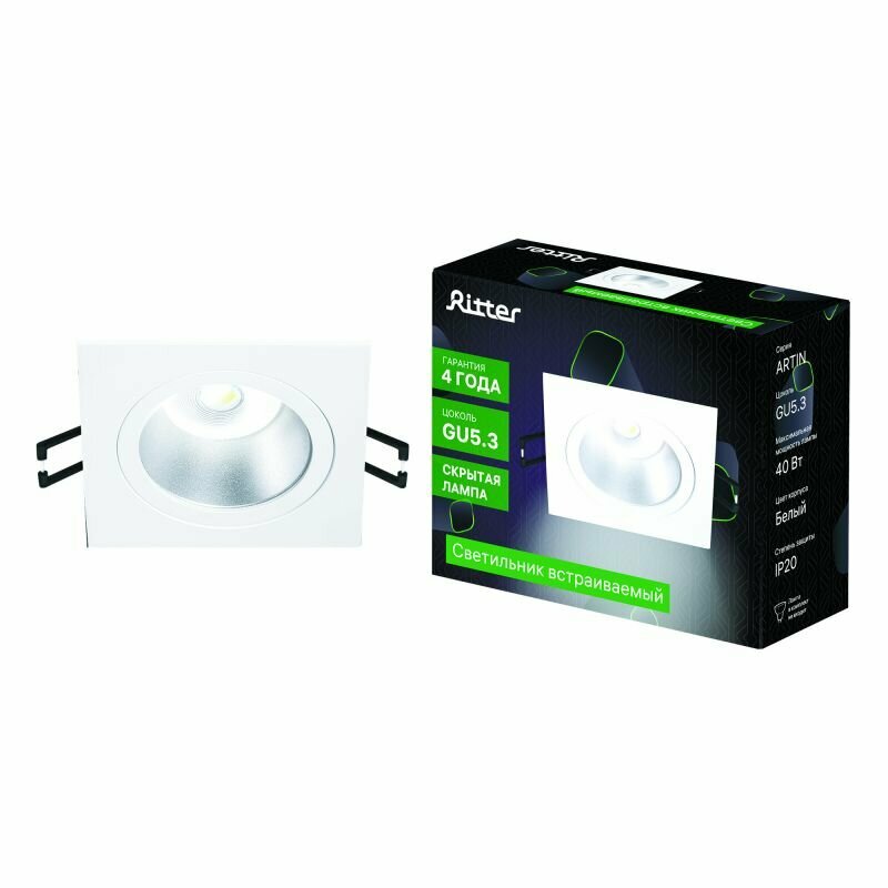 Светильник встраиваемый потолочный Artin, скрытая лампа, 93х93х35мм, монтажное отверстие 80х80мм, GU5.3, алюминий, белый, квадратный Ritter, 51417 6 интересное: