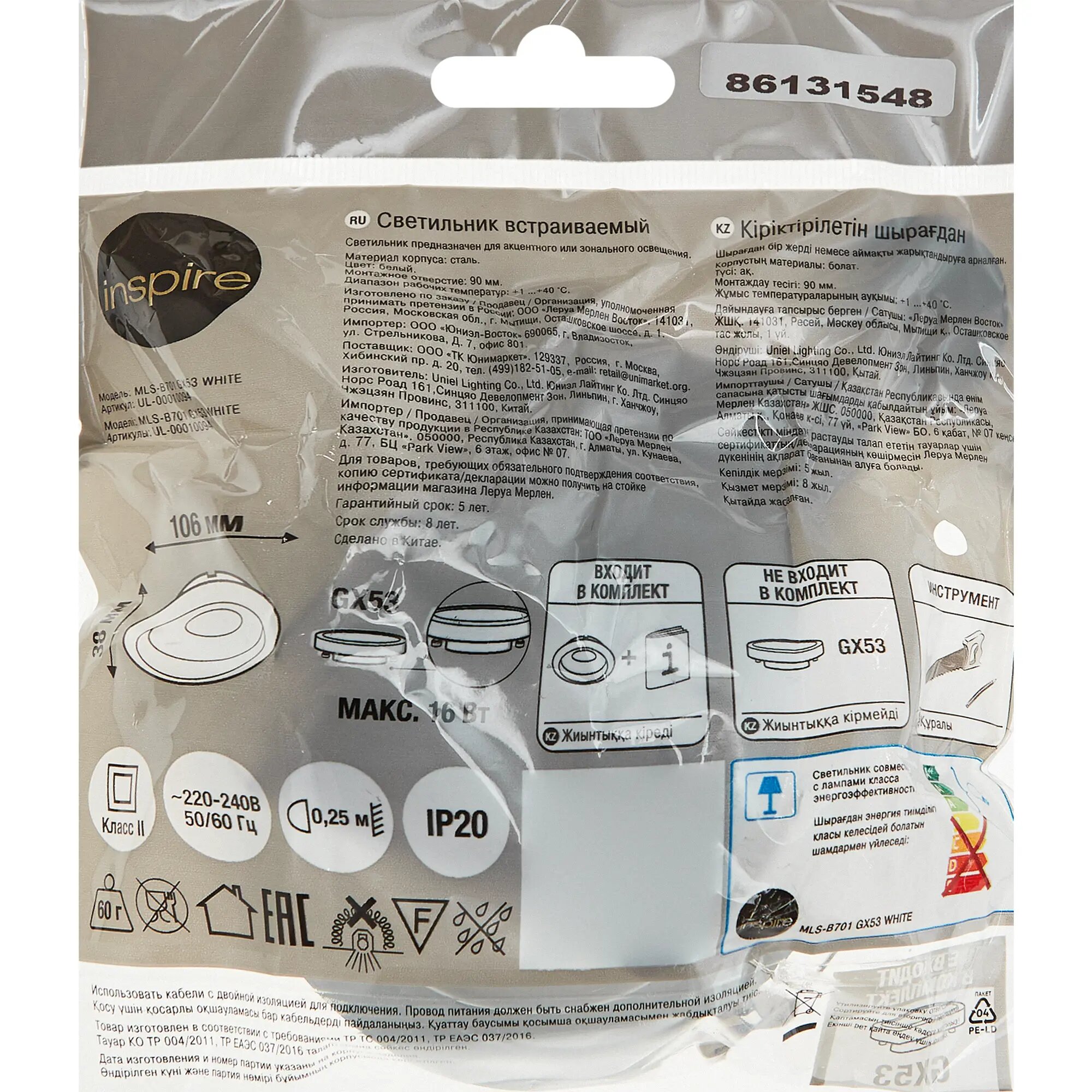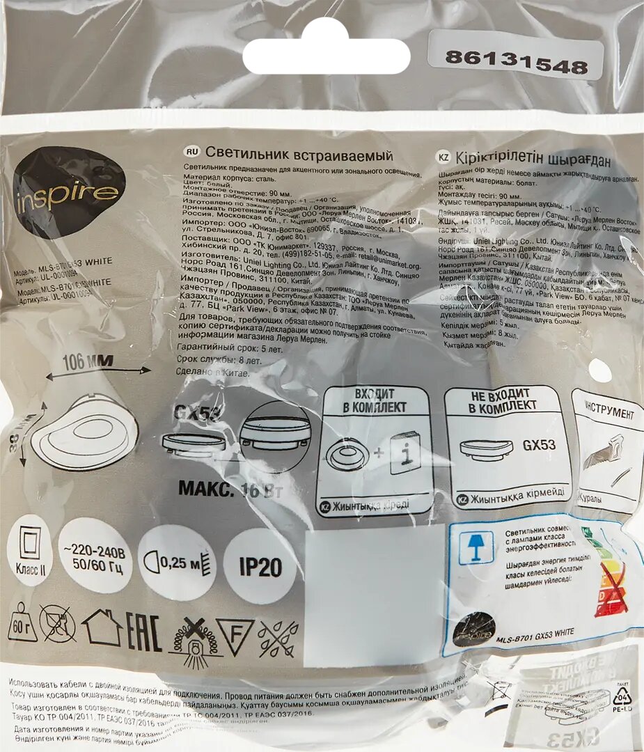 | Комплектация | Спот встраиваемый Inspire Buziet светодиодный под отверстие 90 мм цвет белый |