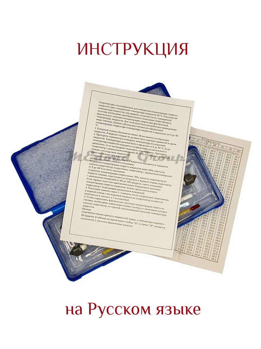 | Подробная комплектация | ареометры для спирта 0-40%, 40-70%, 70-100%, термометр жидкостной 0-50С, Инструкция, футляр |