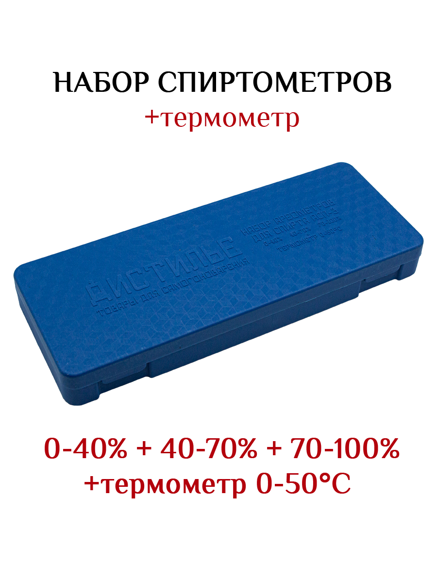 | Подробная комплектация | ареометры для спирта 0-40%, 40-70%, 70-100%, термометр жидкостной 0-50С, Инструкция, футляр |