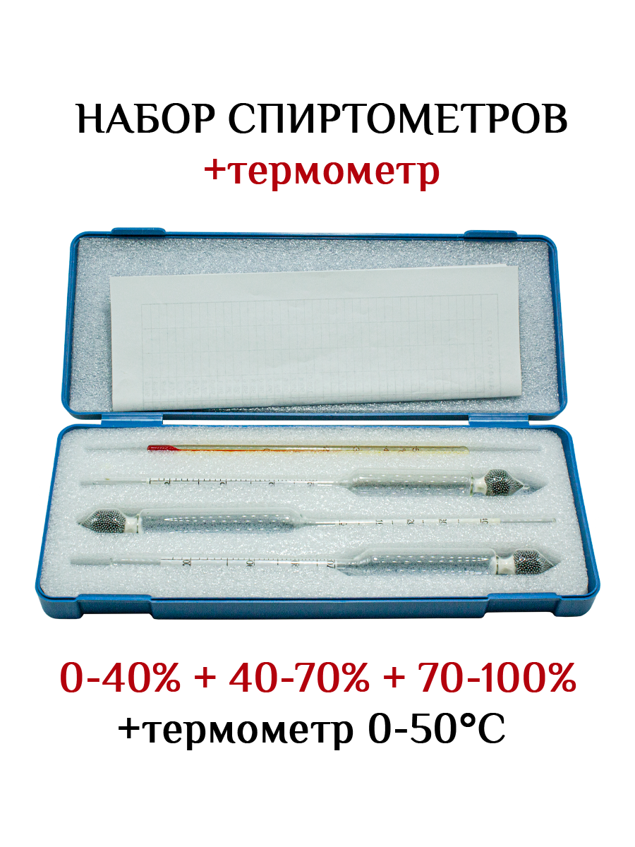 Набор профессиональных ареометров спиртометров 3шт: 0-40, 40-70, 70-100% + термометр. АСП-3 аналог