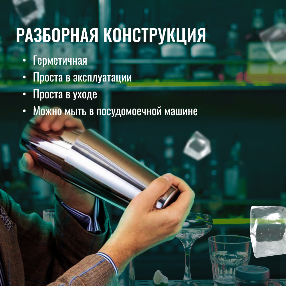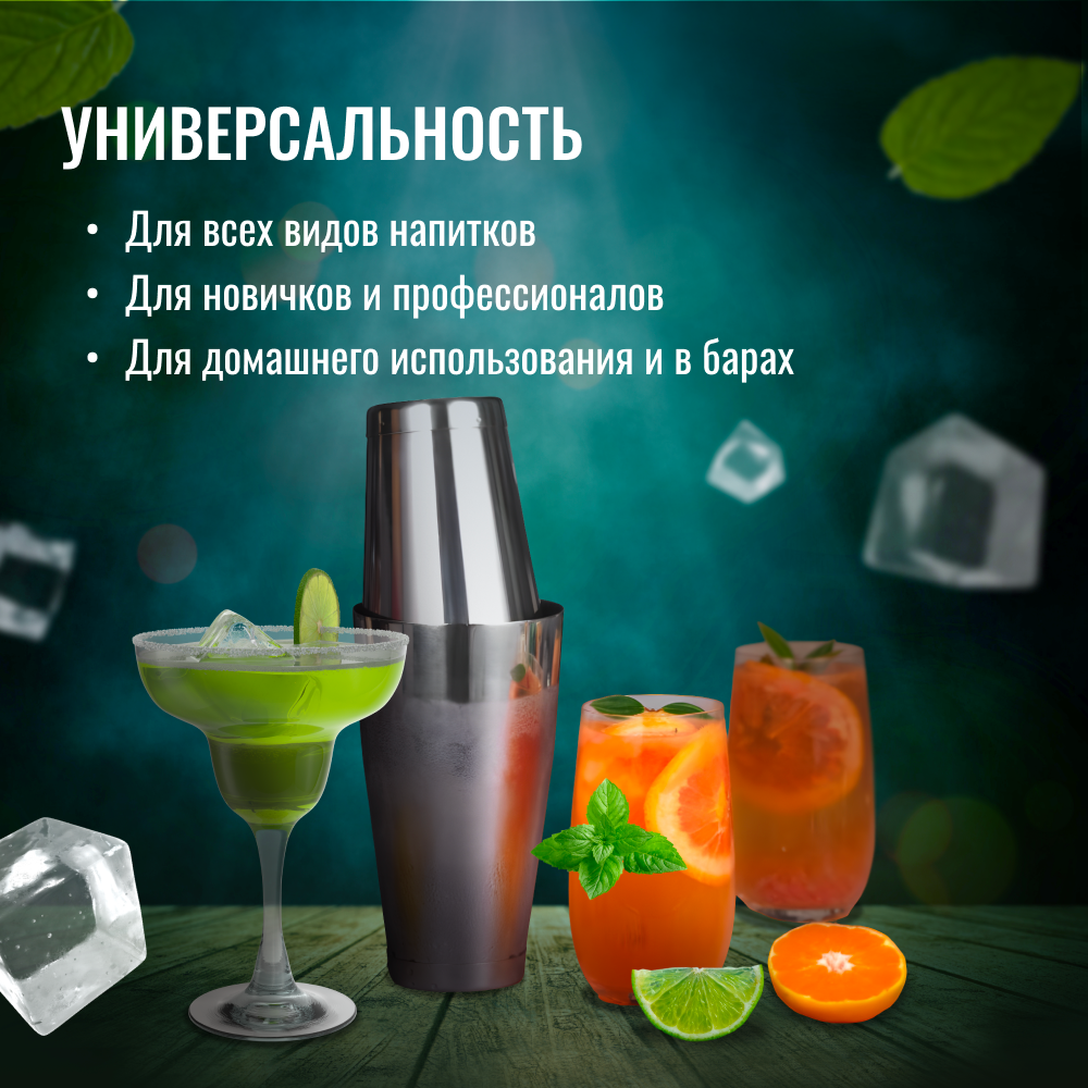 | Подробная комплектация | Шейкер бармена с отверстиями для фильтрации; Коктейльная ложка; Открывашка; Стрейнер; Мадлер; Щипцы. Мерный стакан |