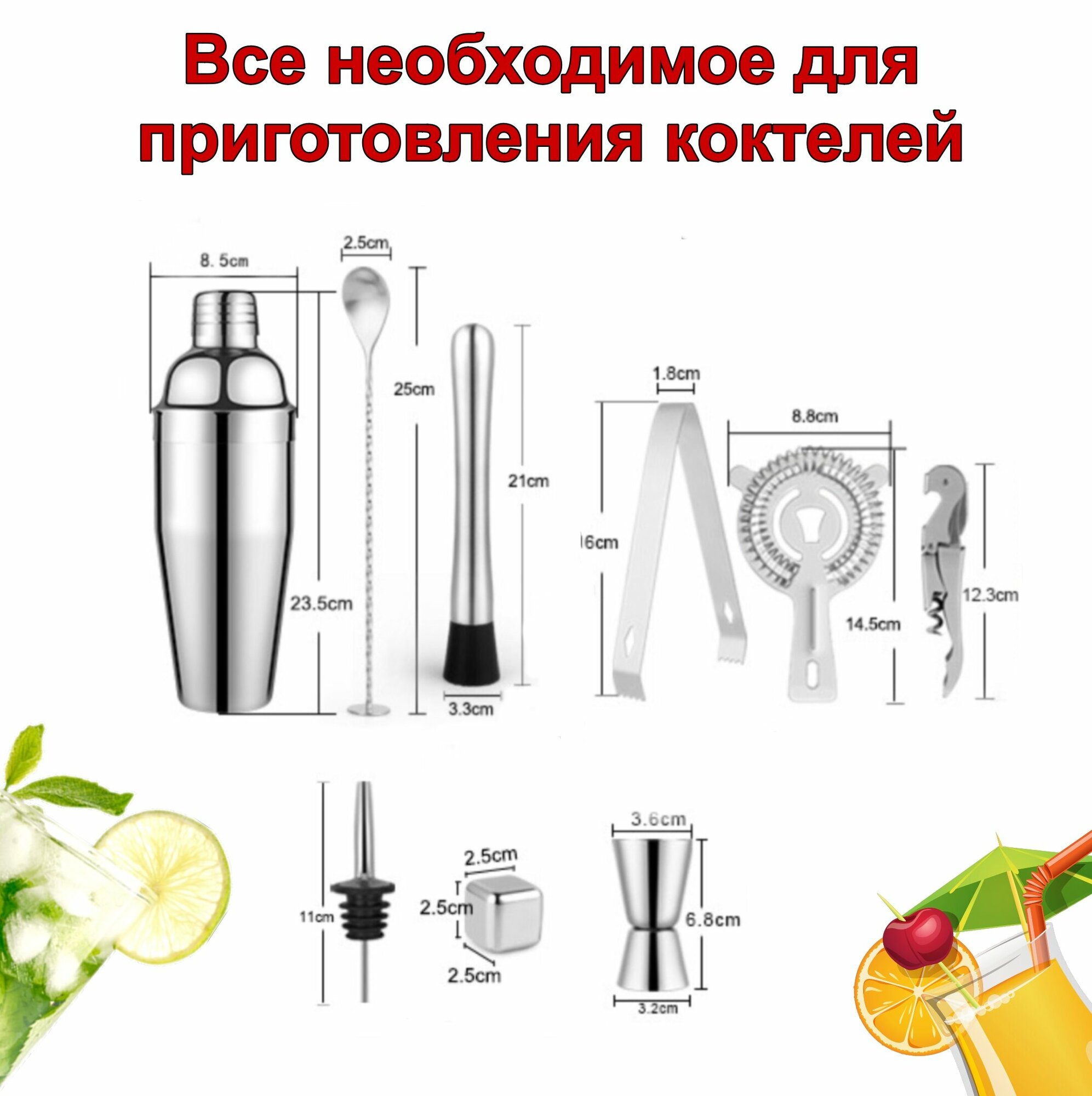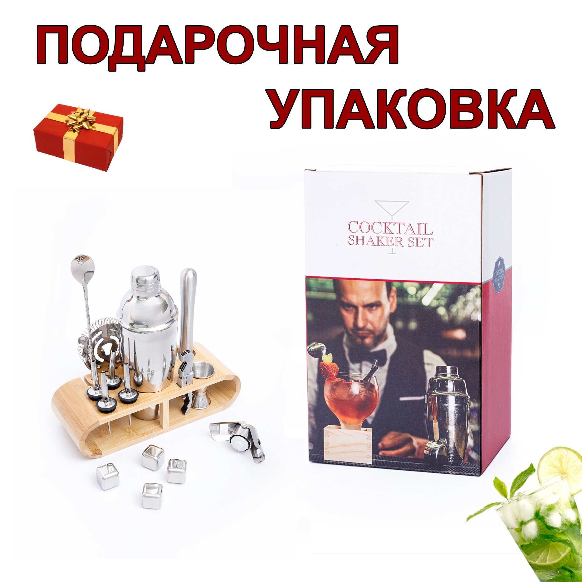 | Подробная комплектация | 1 Европейский шейкер 750 мл, 2 штопор 3 стрейнер 4 длинная ложка с пяткой 5 мадлер 6 щипцы для кубиков и льда 7 джиггер 15/30мл 8 джиггер 25/50мл 9 щетка для трубок 10 гейзеры для равномерного разлива напитков 4шт. 11 охлаждающие кубики 4шт. 12 трубочки прямые 2шт. 13 трубочки изогнутые 2шт. 14 пробки 2шт. 15 подставка 16 рецепты коктейлей (на английском) |