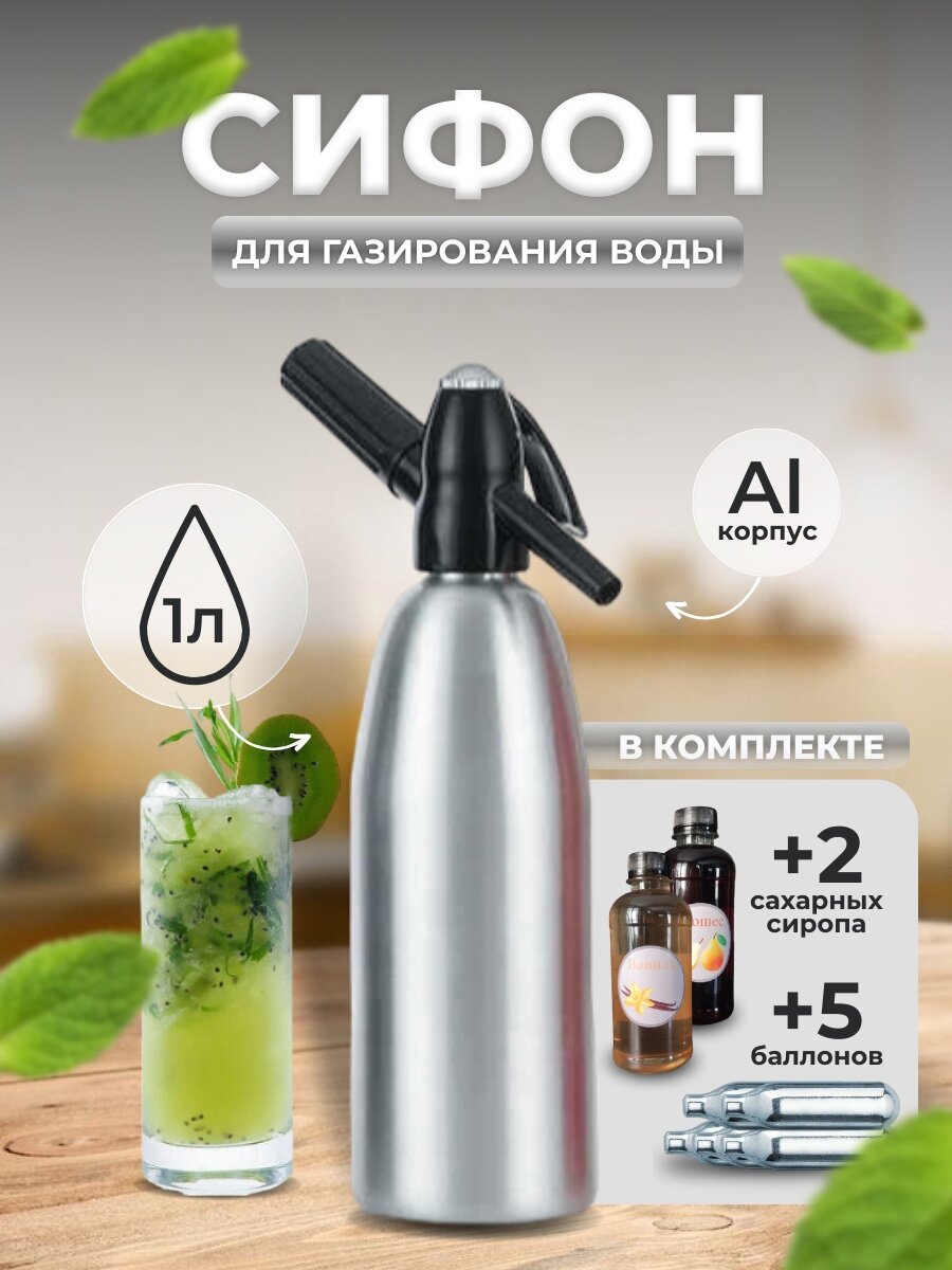 Купить Сифон для газирования воды, 1 л, серебристый, сиропы и баллончики