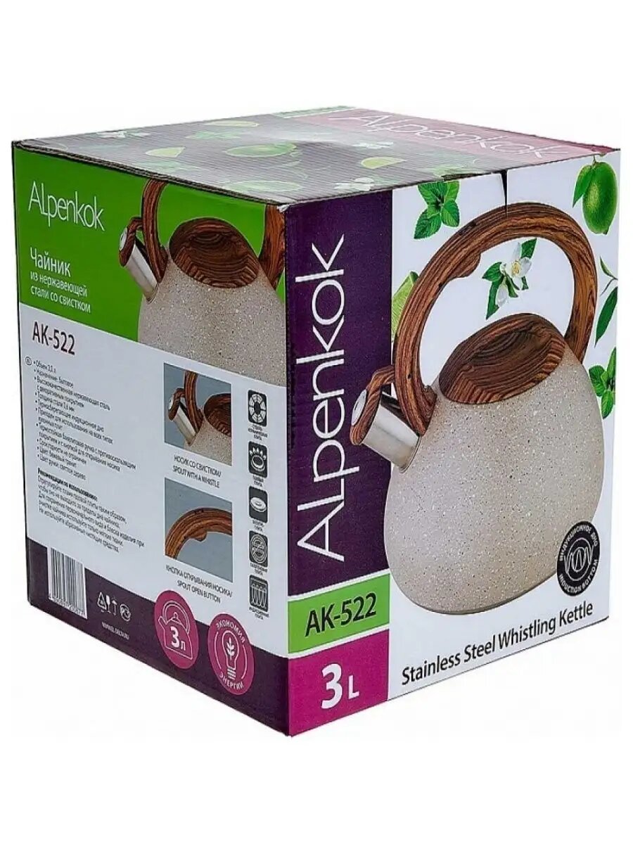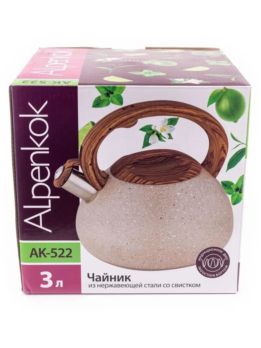 Чайник Alpenkok AK-522, 3 литра, нержавеющая сталь, свисток, для всех типов плит, бежевый гранит