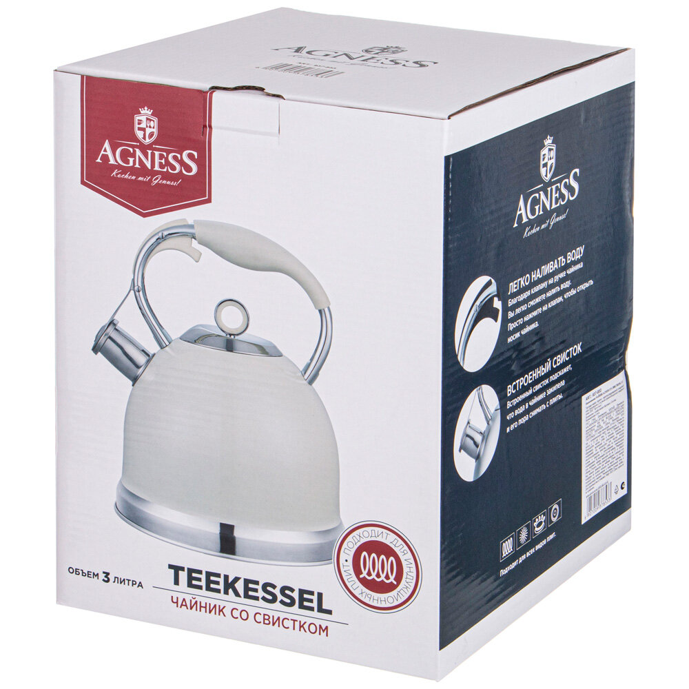 Купить Чайник со свистком Agness 3л, индукционное капсульное дно, молочный, нержавеющая сталь
