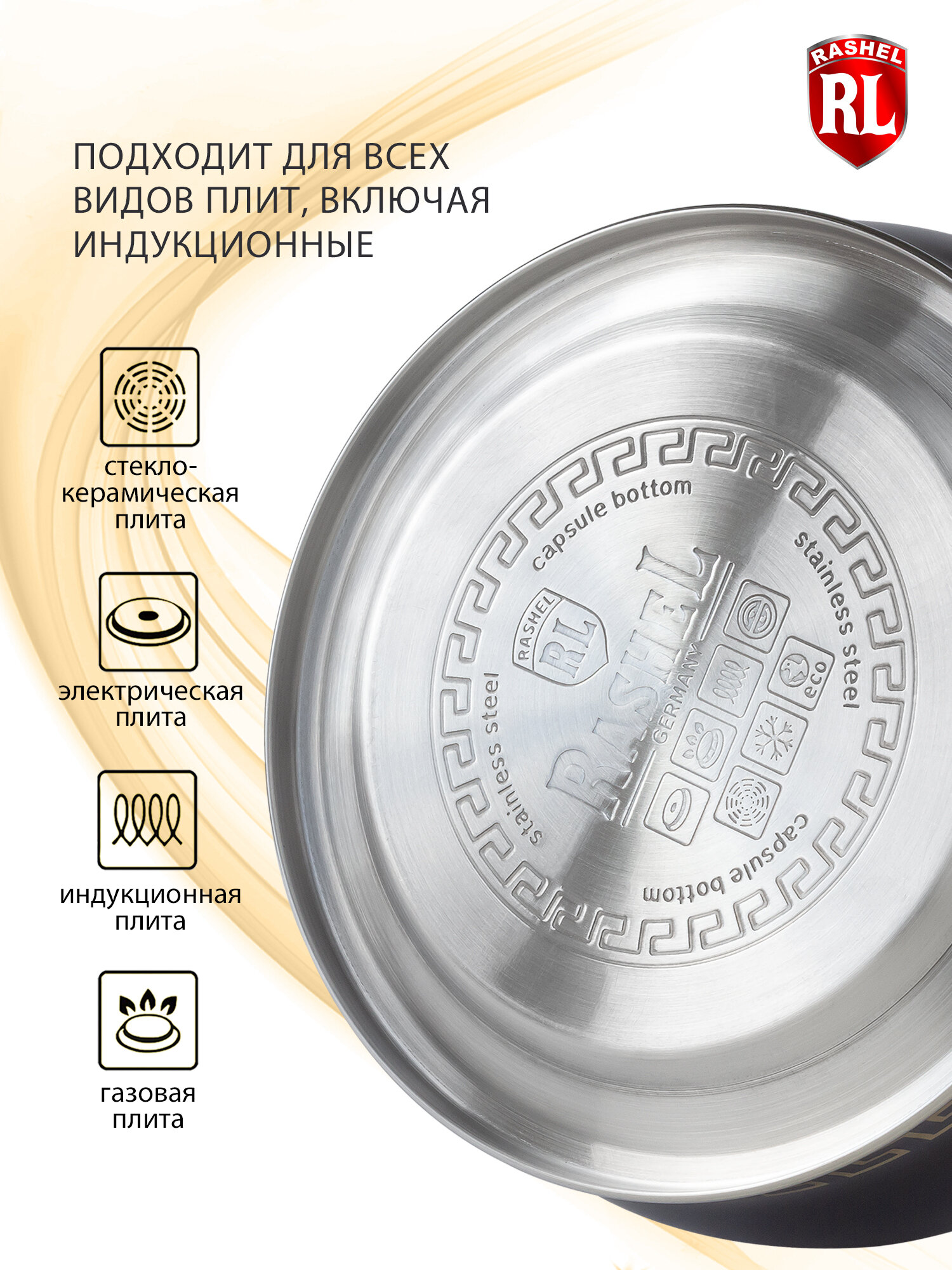 Чайник нержавеющая сталь, 3.2 л, со свистком, зеркальный, RasheL, индукция, кремовый, М-7906