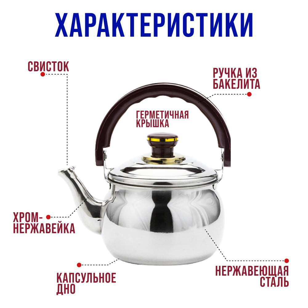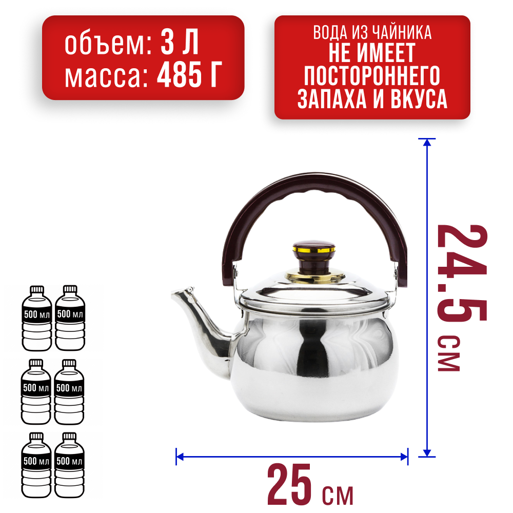 | Дополнительная информация | Диаметр чайника: 18 см. Диаметр горлышка: 15,5 см. Диаметр дна: 14,5 см. Длина общая: 25 см. Высота борта: 12 см. Высота с ручкой: 24,5 см. |