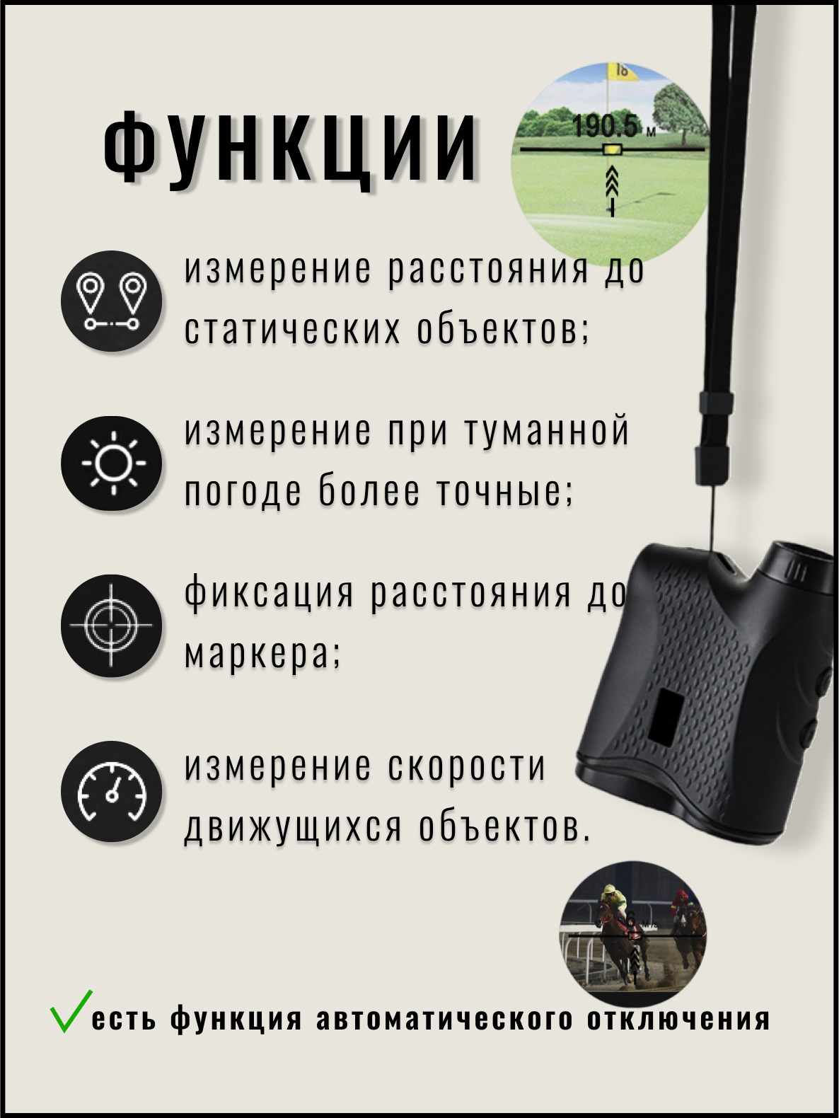 | Функции и особенности | автоматическое отключение, для охоты, с прицелом, ударопрочный корпус, функция расчета углов |
