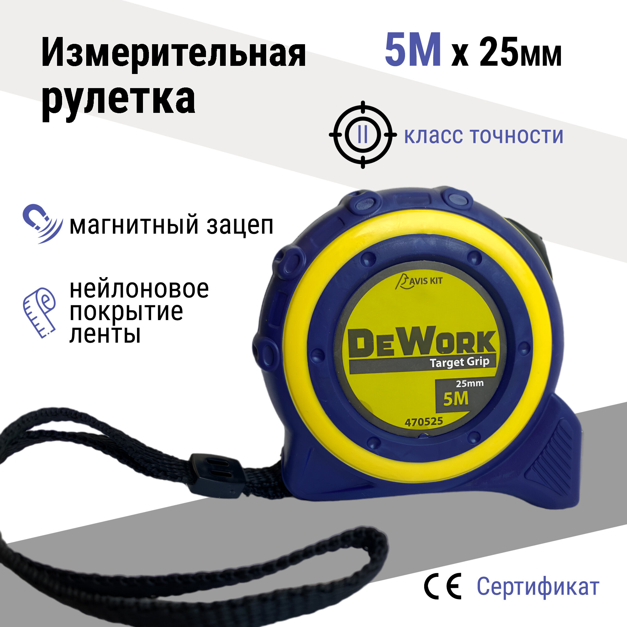 Купить Рулетка строительная DeWork Target Grip 5м x 25мм, магнитный зацеп, двухкомпонентная