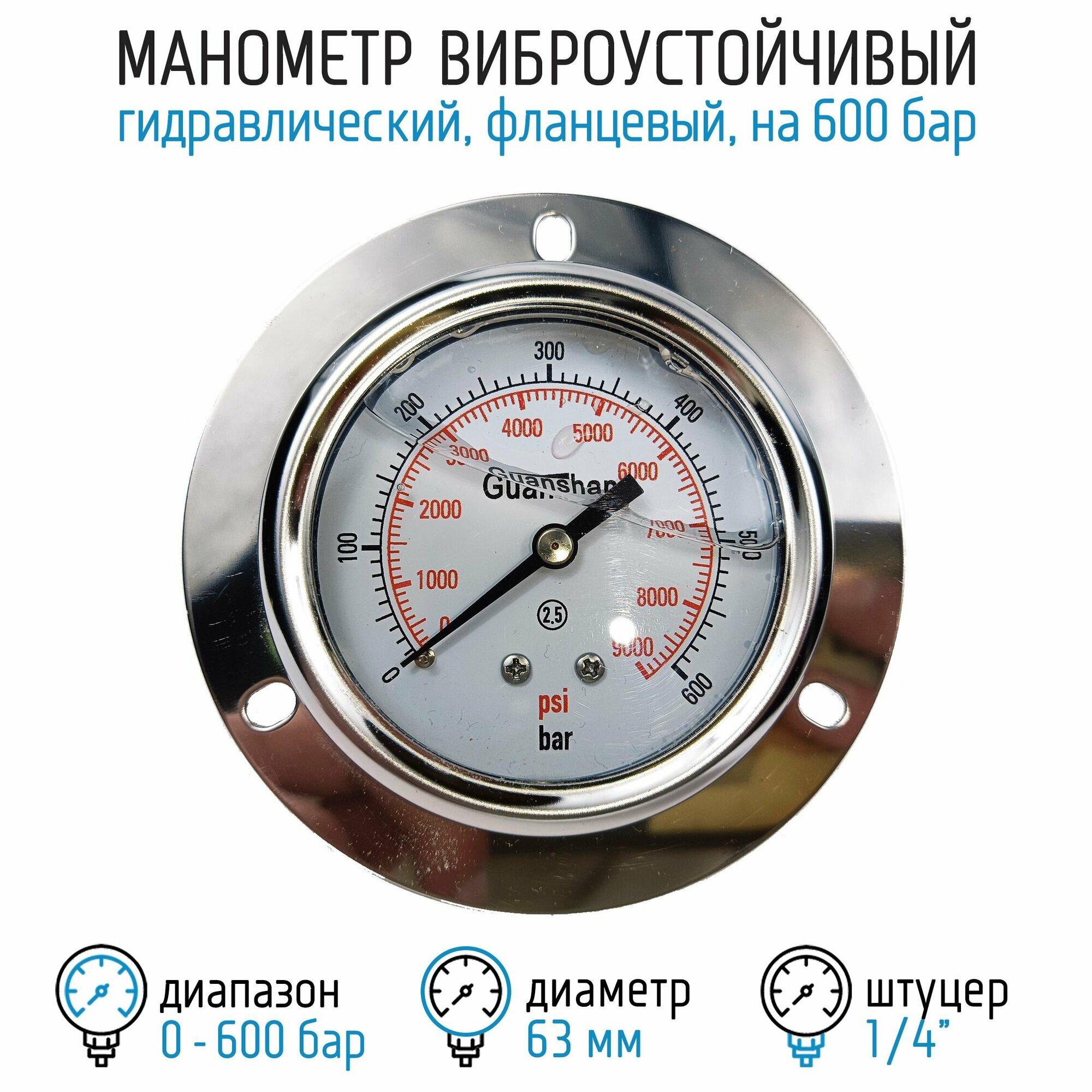 Манометр виброустойчивый YN63Z на 600 бар, 63 мм, G 1/4" фланцевый, глицериновый интересное: