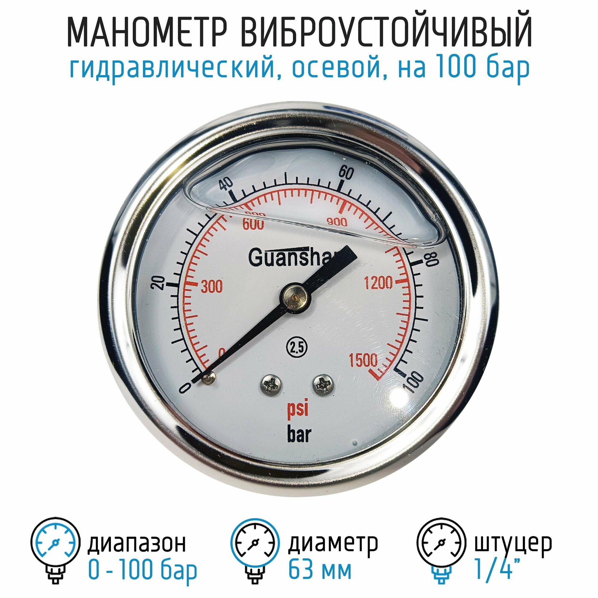 Купить Манометр виброустойчивый YN63Z на 100 бар, 63 мм, G 1/4" осевой, глицериновый