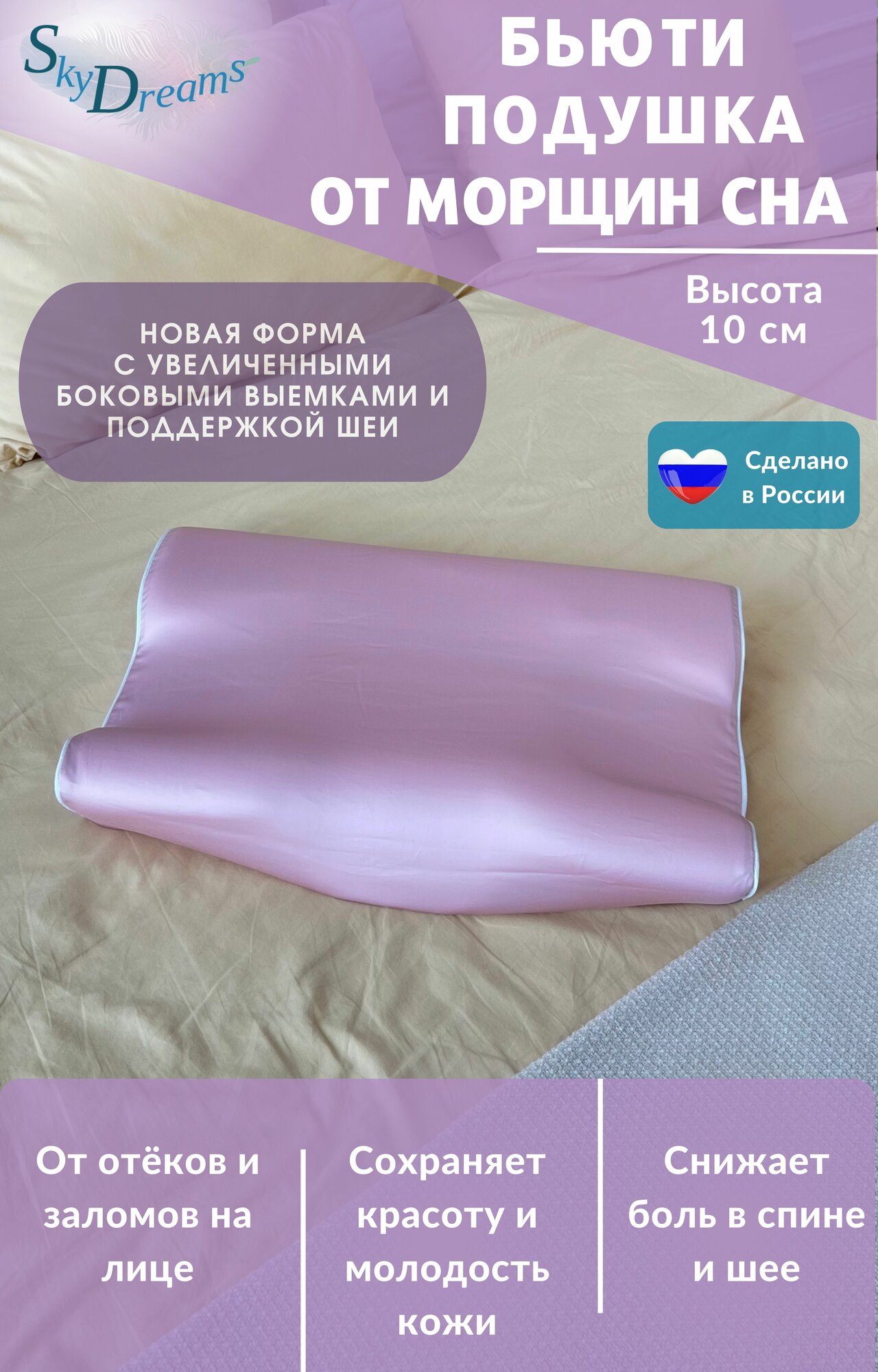 SkyDreams Ортопедическая бьюти подушка от морщин, 55х36х10 см, высота 10см, Tencel, цвет розовый интересное: