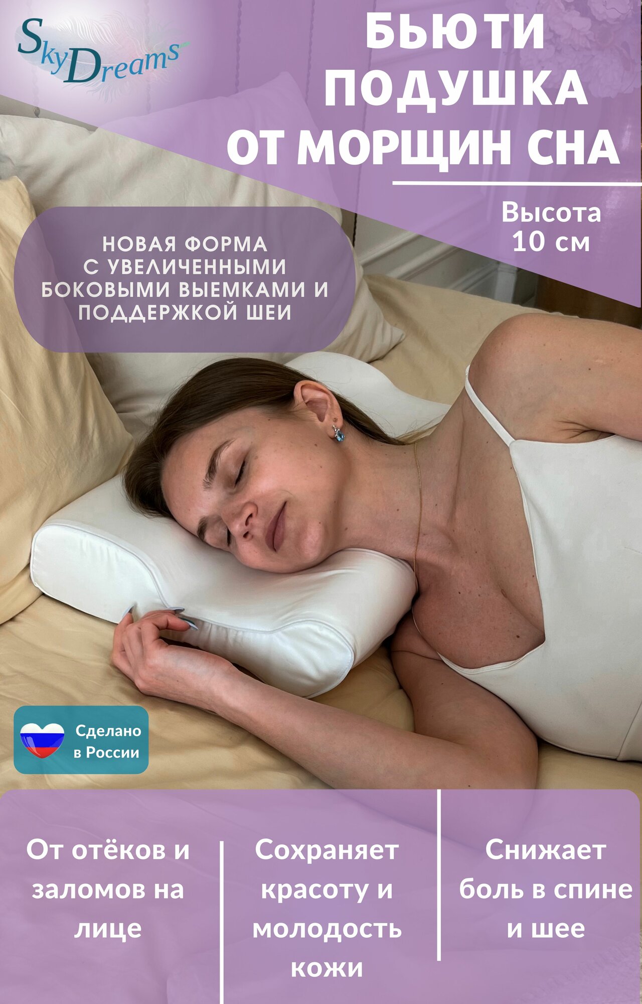 SkyDreams Ортопедическая бьюти подушка от морщин, 55х36х10 см, высота 10см, Tencel, цвет белый интересное: