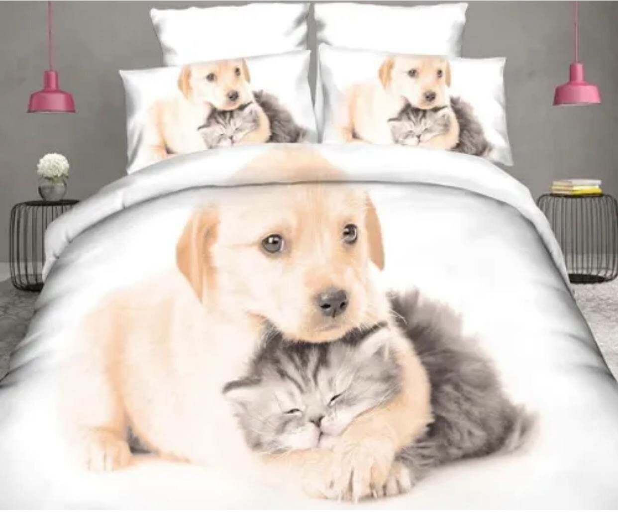 Комплект постельного белья, Поплин, 2 спальный, наволочки 70x70, Кошечка с собакой
