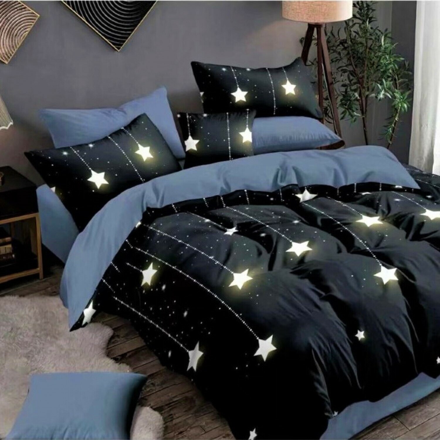 Постельное белье Сатин 2 спальный с простыней на резинках по углам Наволочки 70x70 Хлопок Aimee SAYA HOME Звезды. Синий