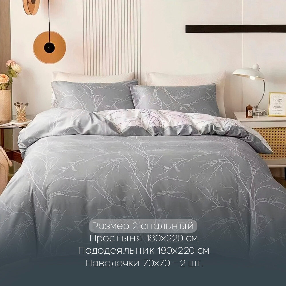Постельное белье Сатин 2 спальный с простыней на резинках по углам Наволочки 70x70 Хлопок Aimee SAYA HOME Серый.