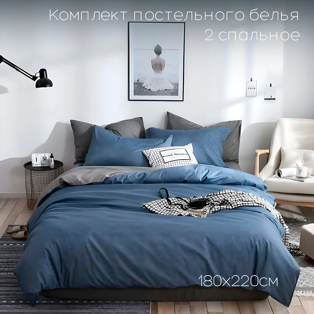 СохранитьПостельное белье Сатин 2 спальный с простыней на резинках по углам Наволочки 70x70 Хлопок Aimee SAYA HOME Синий. Серый. интересное: