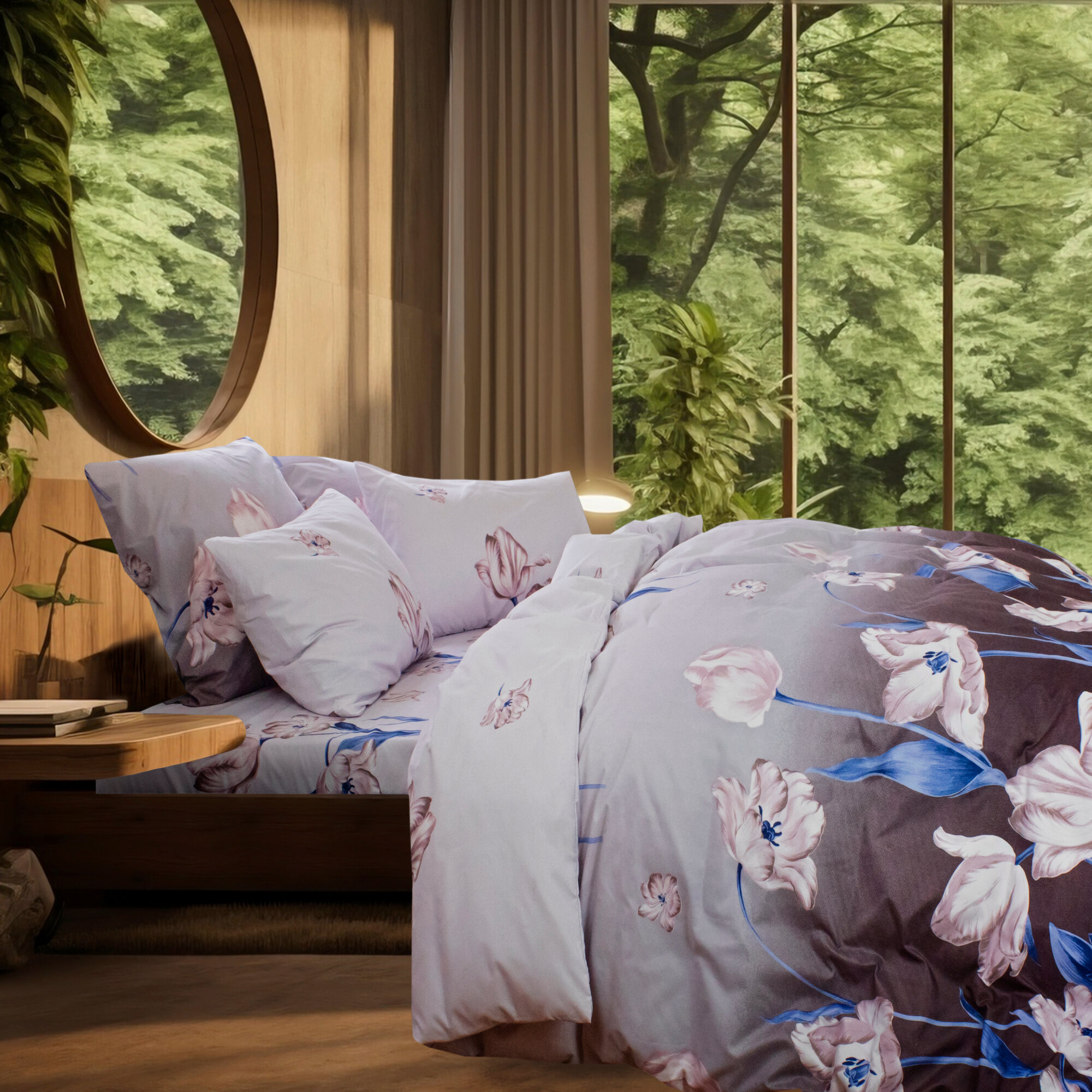 Постельное белье семейное с цветочным принтом Cleo Art Color, комплект из полисатина с двумя пододеяльниками