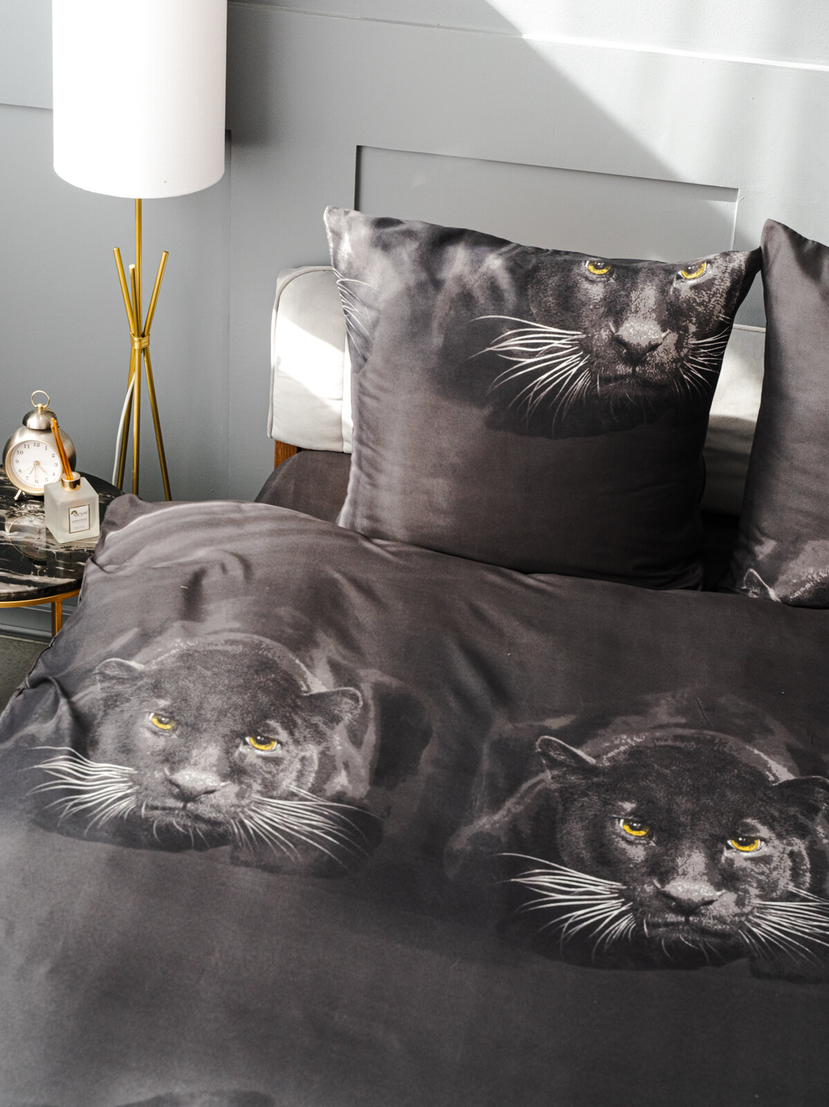 Постельное белье евро макси Павлина Пантера на черном, Полисатин, наволочки 70x70