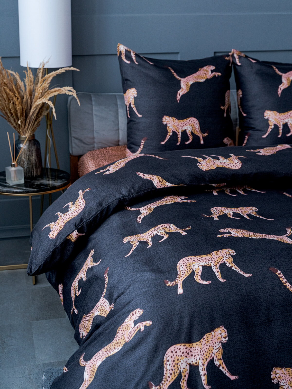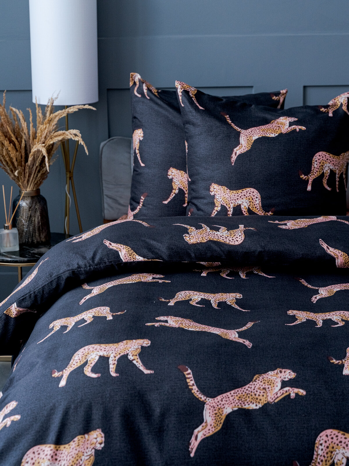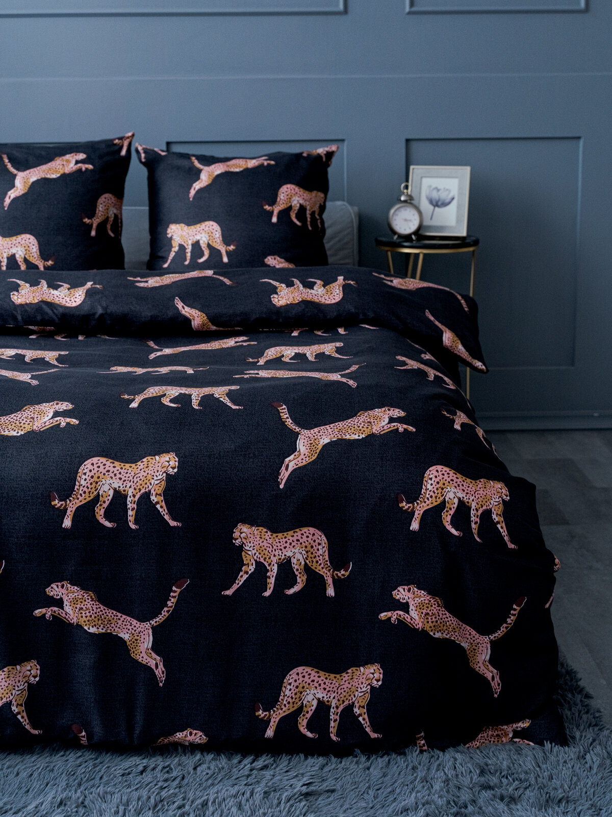 Постельное белье 1.5 спальное Павлина Пантера на черном, Полисатин, наволочки 70x70
