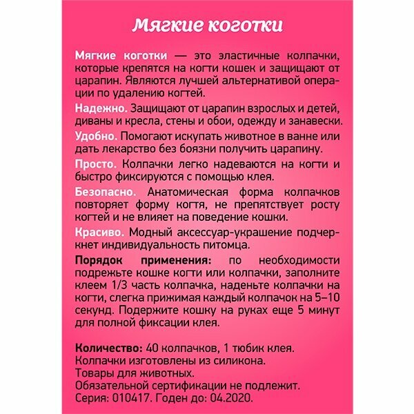 Когти накладные антицарапки для кошек Cliny Мягкие коготки розовые 40 шт