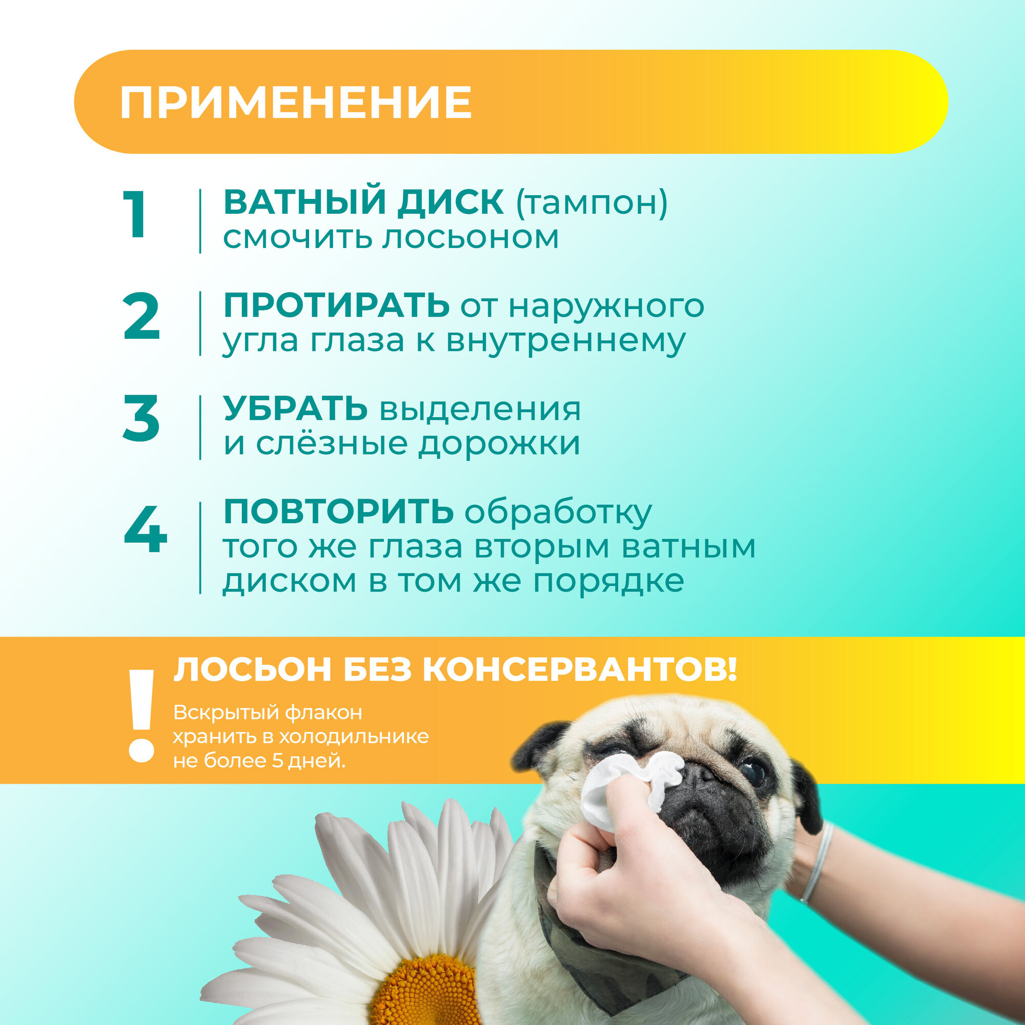 | Способ применения | Обработку проводят ватным тампоном, смоченным лосьоном, от наружного угла глаза к внутреннему, с удалением выделений. Затем повторяют обработку уже очищенного глаза вторым ватным тампоном в том же порядке. |