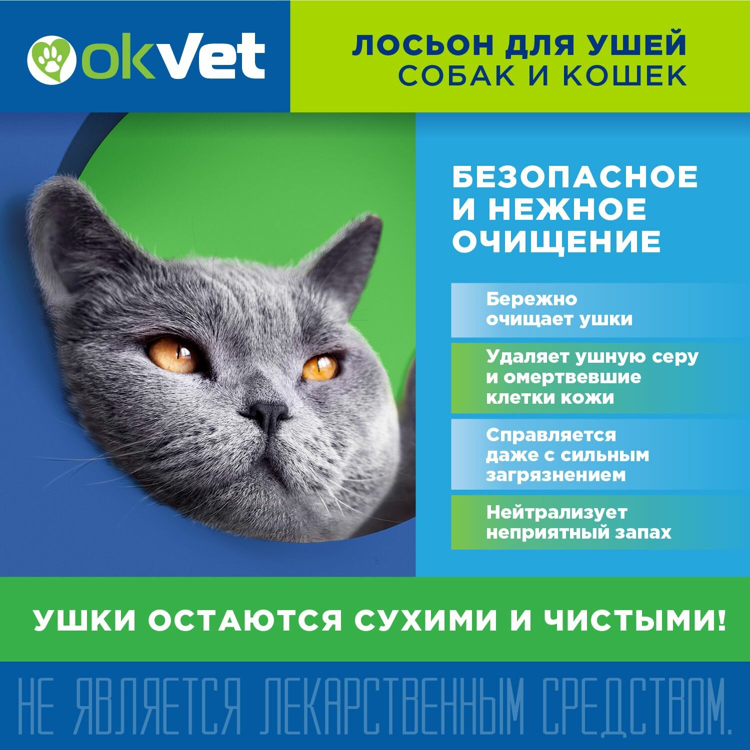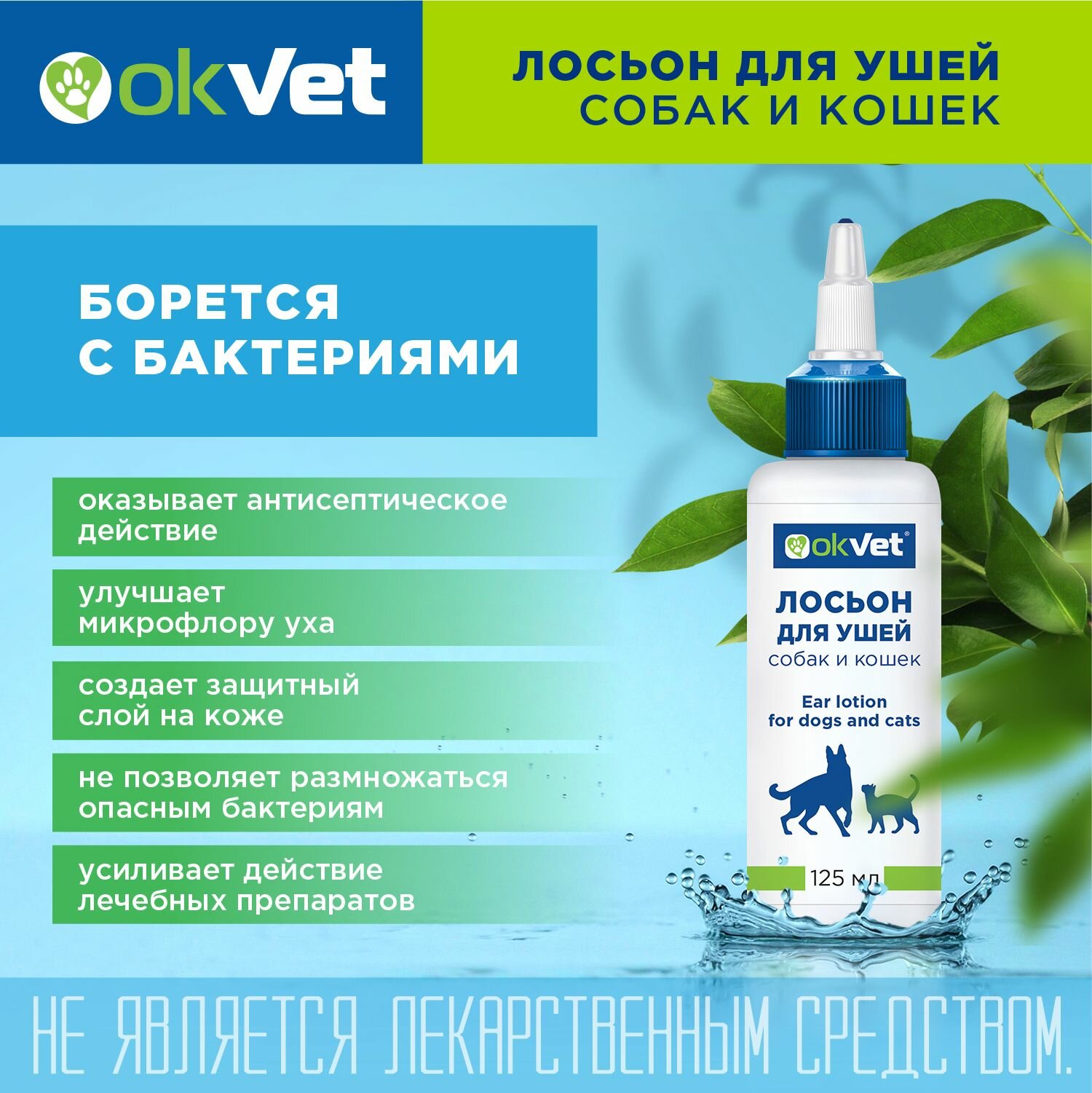 Лосьон для чистки ушей для кошек и собак OKVET, 125 мл. Не оставляет пятен на шерсти и коже. интересное: