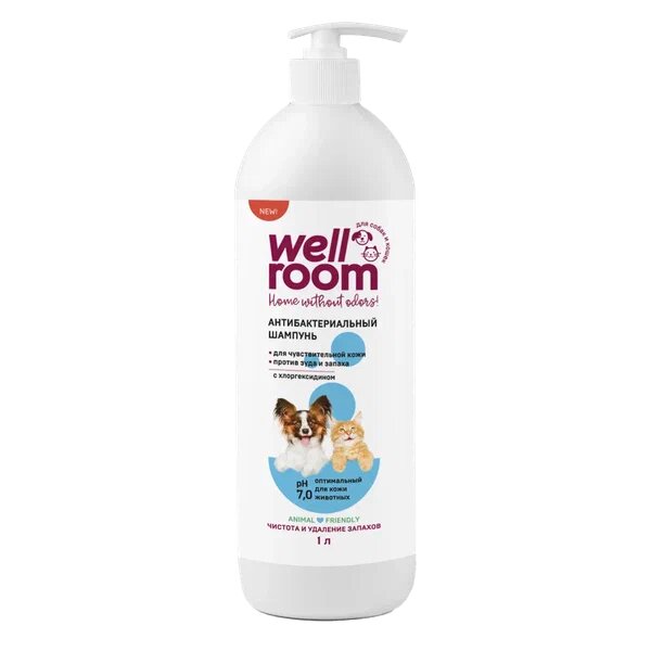 Универсальный антибактериальный шампунь для кошек и собак с хлоргексидином Wellroom 1 литр интересное: