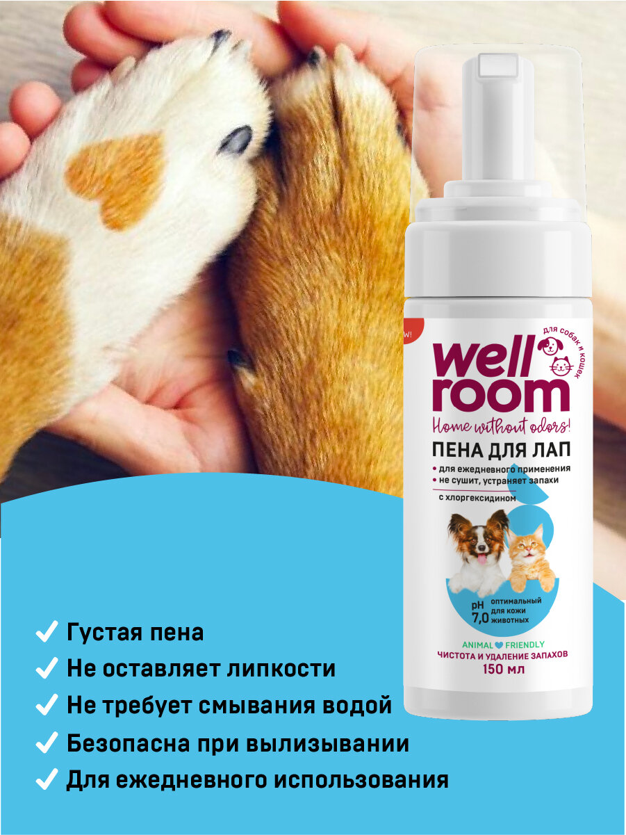 Пенка для мытья лап - шампунь для кошек и собак с хлоргексидином Wellroom интересное: