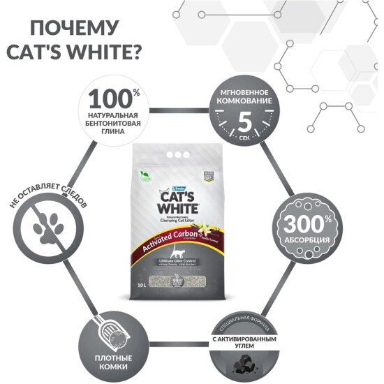 Наполнитель для кошачьих туалетов Cat's White Activated Carbon комкующийся, бентонитовый с активированным углем (10л)