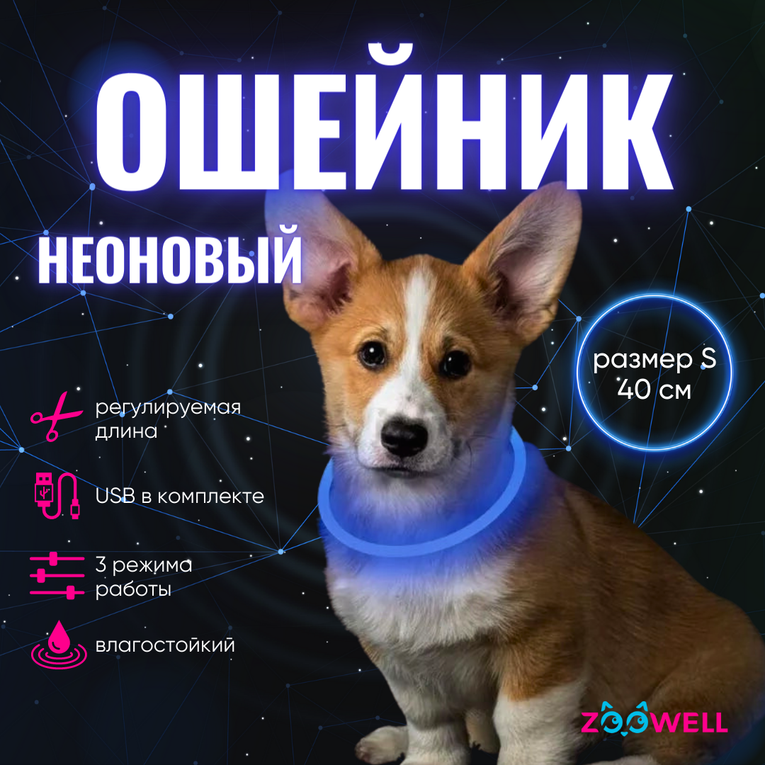 Ошейник для собак светящийся LED 40 см синий, ZOOWELL, размер S