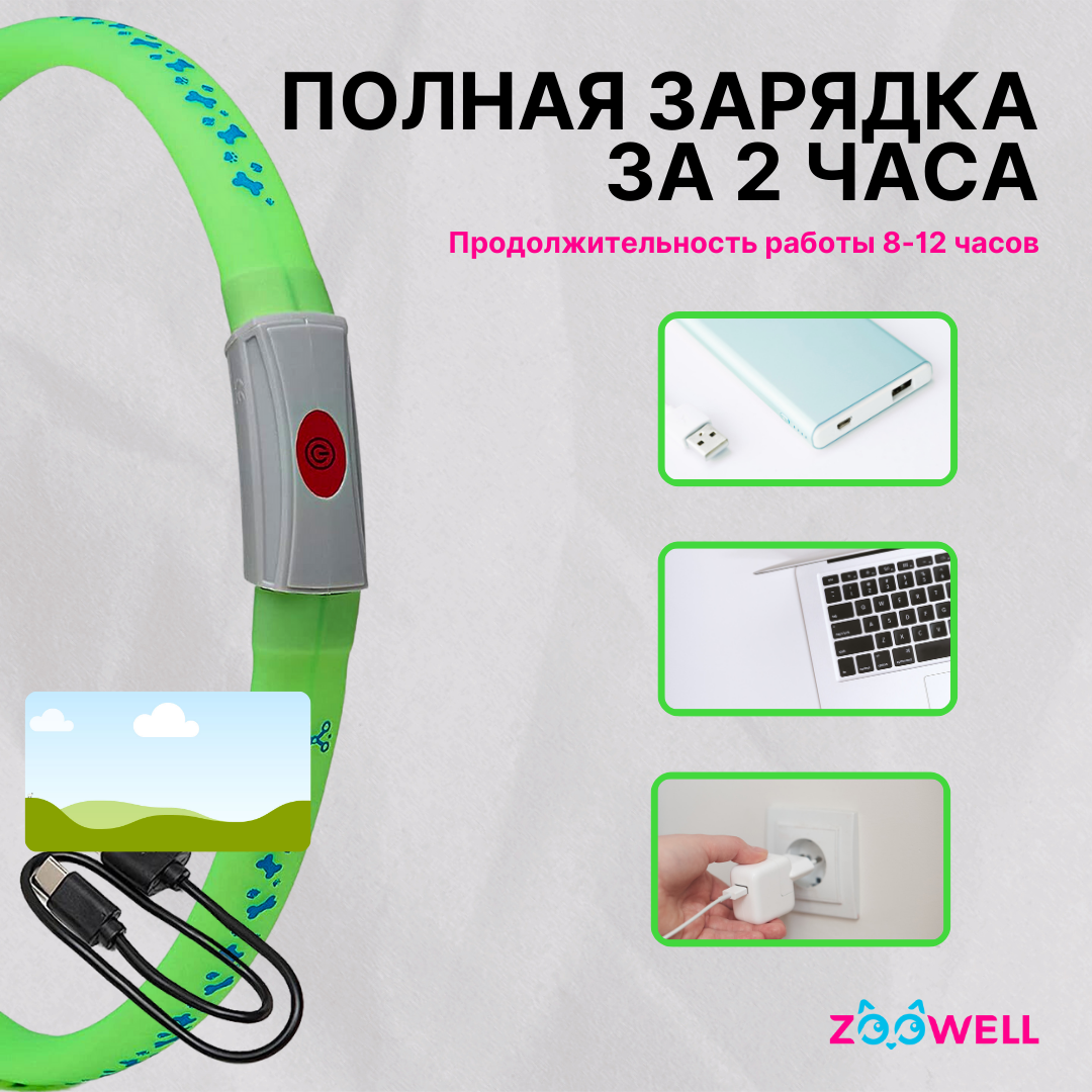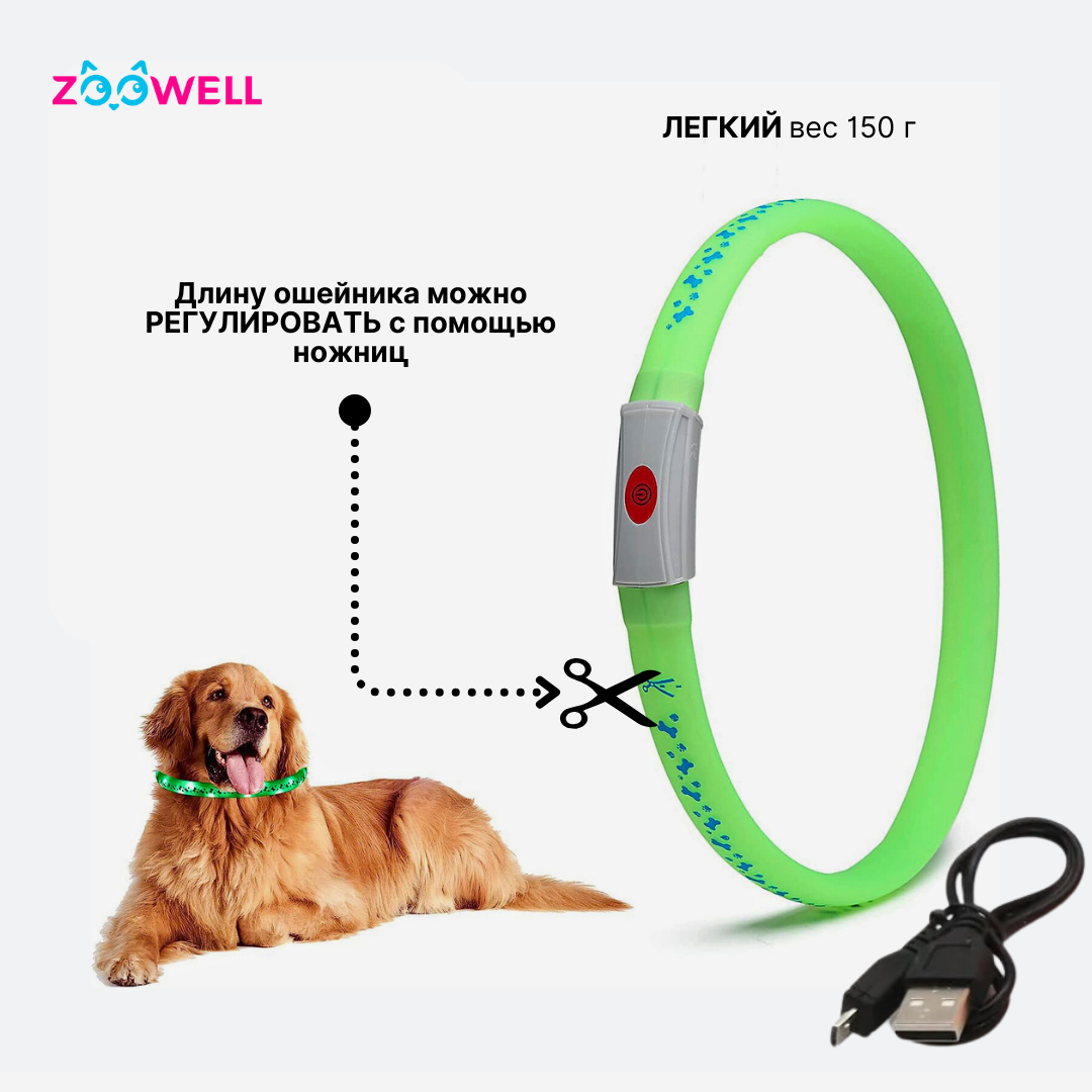 Ошейник для собак/ светящийся ошейник/ собачий ошейник LED 70 см с зеленый, ZOOWELL