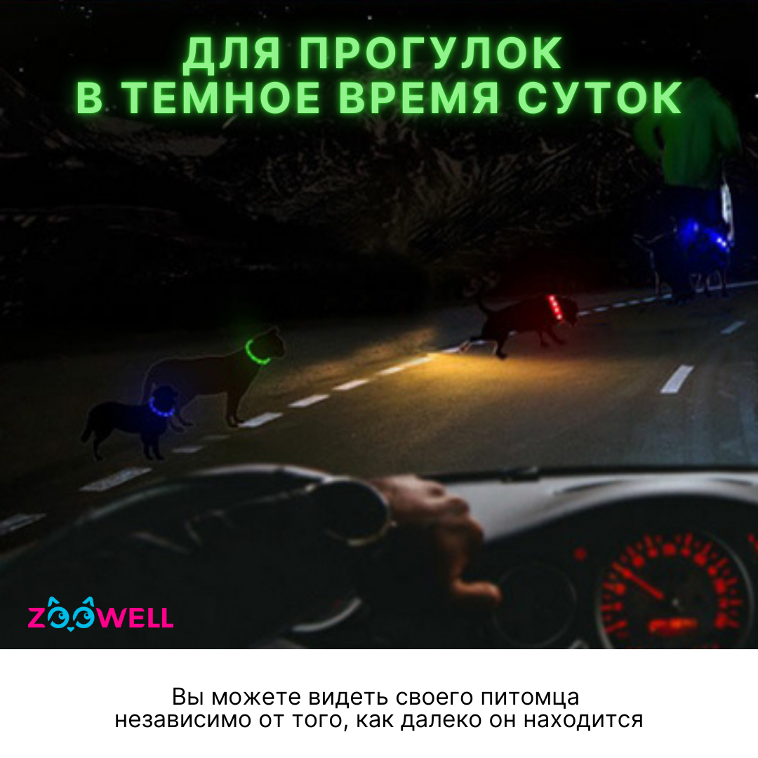 Ошейник светящийся для собак LED, 55см, для выгула в темное время суток ZOOWELL