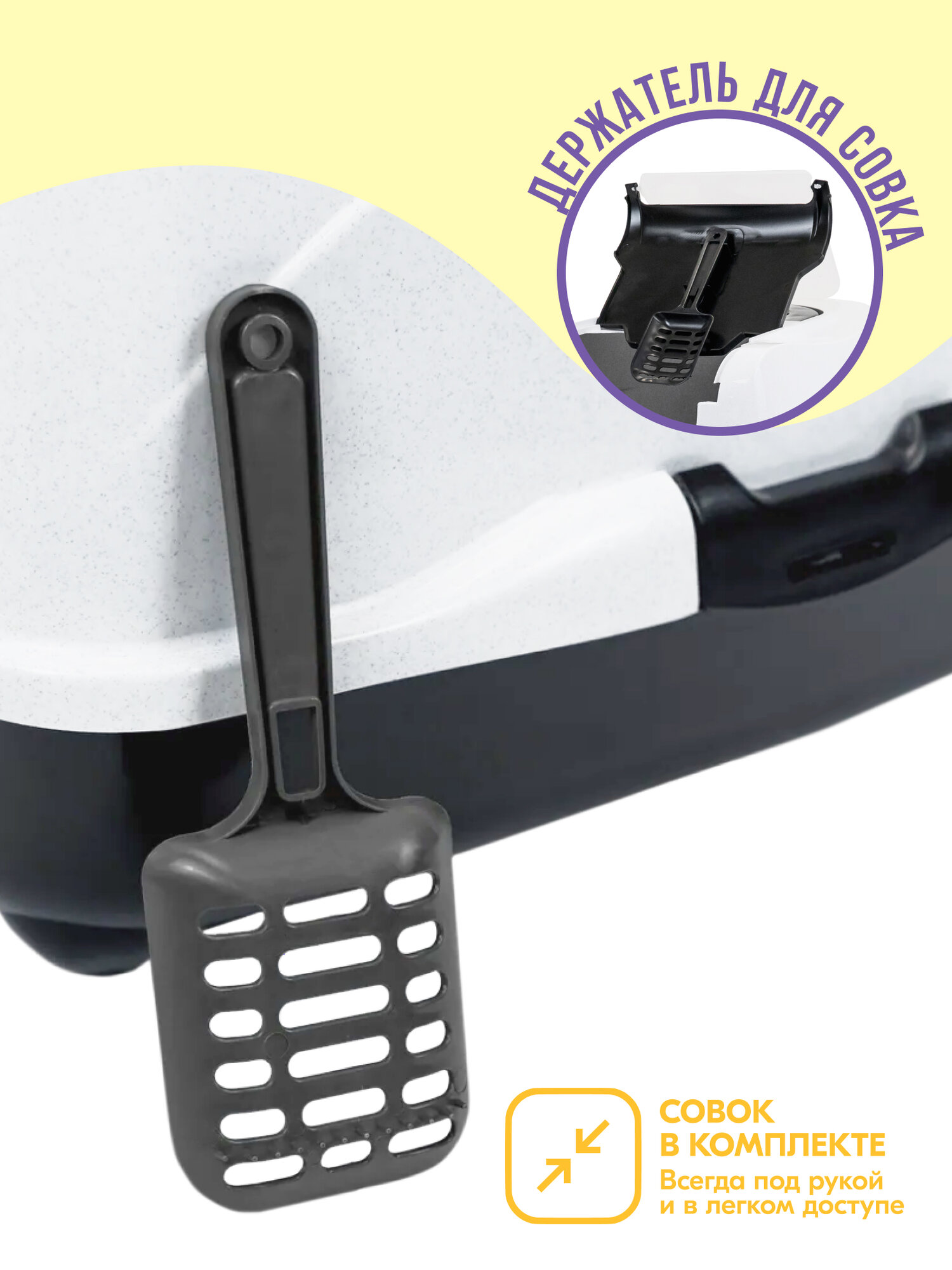 Купить Туалет для кошек 50 х 38 х 37 см, лоток закрытый и совок "Pettails" домик с дверцей, черный низ/белый верх