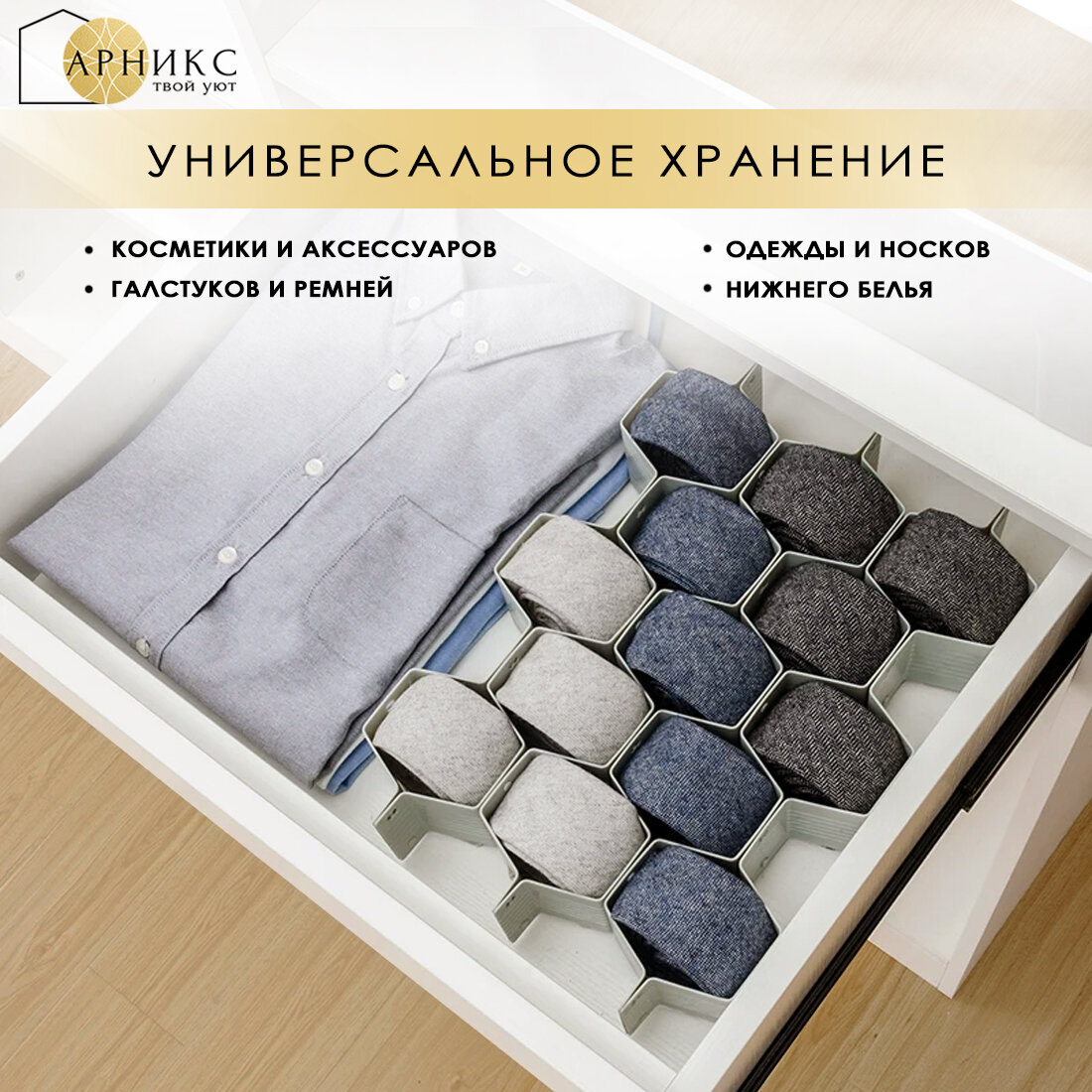 Разделители ящиков "соты", органайзер для хранения вещей, набор из 18-ти ячеек, 35х34х7см, цвет: серый интересное: