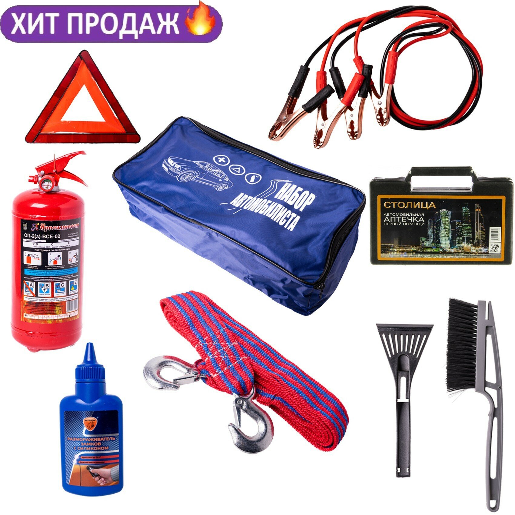 | Подробная комплектация | 1. Сумка матерчатая, водонепроницаемая, износостойкая для хранения комплекта 2. Аптечка первой помощи в пластиковой коробке (в соответствии с Приказом) для прохождения ТО 3. Огнетушитель ОП-2(2 кг) 4. Знак аварийной остановки с пеналом (соответствует Требованиям ГИБДД) 5. Провода для "прикуривания" 300 А 6. Щётка для снега со скребком 7. Трос с крюками на 5 тонн 8. Размораживатель замков Сумка с набором автомобилиста как в описании. Элементы комплекта могут незначительно отличаться от фото, но не по характеристикам |
