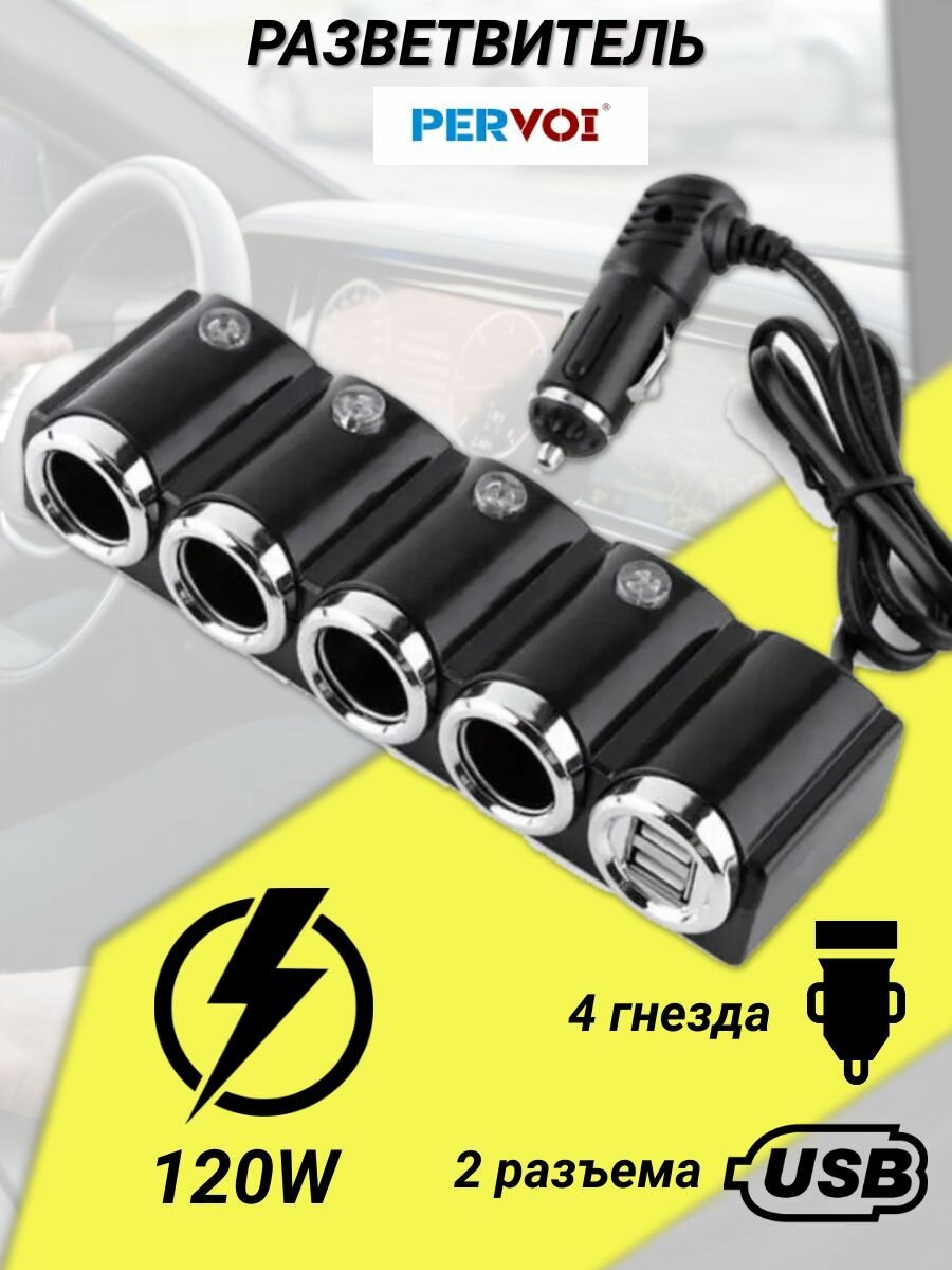 Разветвитель в машину на 4 гнезда прикуривателя, 2 USB Pervoi 612 для авто, черный интересное: