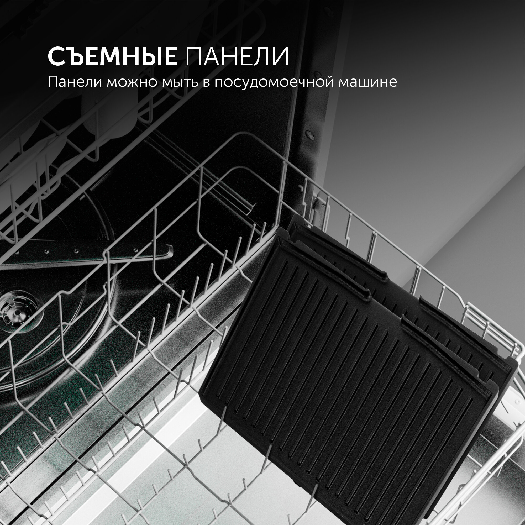 | Особенности | антипригарное покрытие / поддон для сбора жира / регулировка высоты верхней панели / съемные пластины |